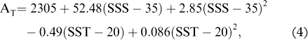 A correlation between the surface AT and temperature values was found in our study, suggesting that the temperature could explain some of the AT variability, consistent with the dependence found for surface waters of the world ocean. In particular, Lee et al. (2006) proposed several relationships to estimate AT from salinity and temperature surface measurements. We applied the relationship proposed for the Southern Ocean to our data set:
