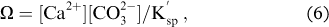 where is the ion product of the concentration of calcium and carbonate ions, and K′sp is the solubility product depending on in situ temperature, salinity and pressure and on the particular mineral phase (aragonite is approximately 50% more soluble than calcite [Mucci 1983]). The values of