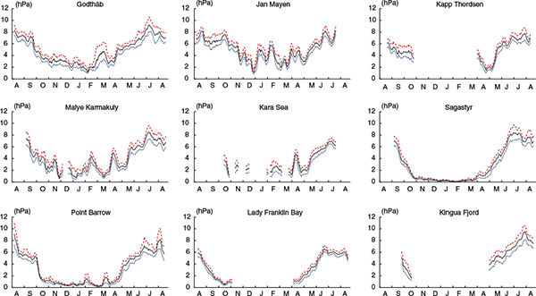 Generally speaking, the water vapour content of the air in the whole Arctic is low because of low temperatures of the air (T). This is a result of both reduced evaporation and a limited water-holding capacity of cold air (Przybylak 2003). Therefore, the annual course of e in the Arctic is very similar to the annual course of T.