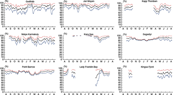 Annual courses of relative humidity parameters (%) in the Arctic in the period of the first International Polar Year, in 1882–83, according to 11-day running averages. Mean daily (black solid line), daily maximum (red dashed line) and minimum (blue dotted line) relative humidity are presented.