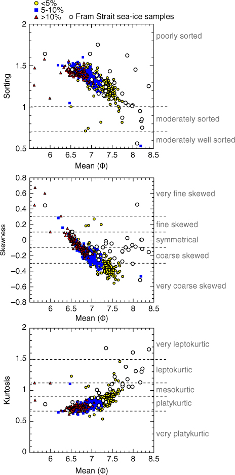 Bivariate plots of silt statistical parameters, with samples coded depending on the % wt >63 µm; triangles ≤5%, squares=5–10% and circles ≥10%. Overlain are results from a similar analysis conducted on 33 sea-ice samples from the Fram Strait (Dethleff & Kuhlmann 2010).