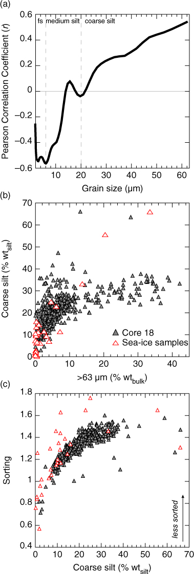 (a) Linear correlation coefficients between % wtsilt in silt size bins and the >63 µm % wt from sieving. (b) Cross-plot of the coarse silt abundance (% wtsilt) and the >63 µm % wt from sieving. (c) Cross-plot of sorting of the silt fraction and the coarse silt abundance (% wtsilt) illustrating that intervals with higher abundances of coarse silt have less well sorted silt distributions. Overlain on (b) and (c) are results from sea-ice samples collected in Fram Strait (Dethleff & Kuhlmann 2010).
