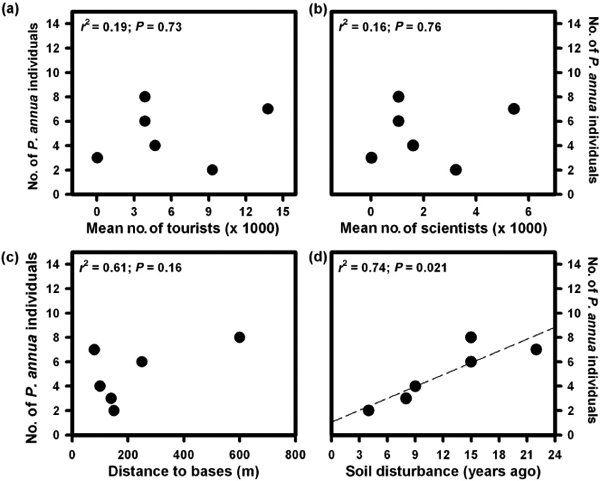 In order to find potential drivers of P. annua establishment, we performed a regression analysis using the abundance of this species and (i) mean number of tourists landed in each point where P. annua has been recorded, (ii) mean number of scientists and operators landed in each point where P. annua has been recorded, (iii) distance to the main building of each station and (iv) level of soil disturbance. We used the time in years from the last time when any building was constructed or renovated at each station as a proxy for soil disturbance. Drawing from the database of the International Association of Antarctica Tour Operators, we considered the mean number of visits (tourists and non-tourists) landed during the 2007/08 and 2009/10 summer seasons—the growing seasons that coincided with our fieldwork.