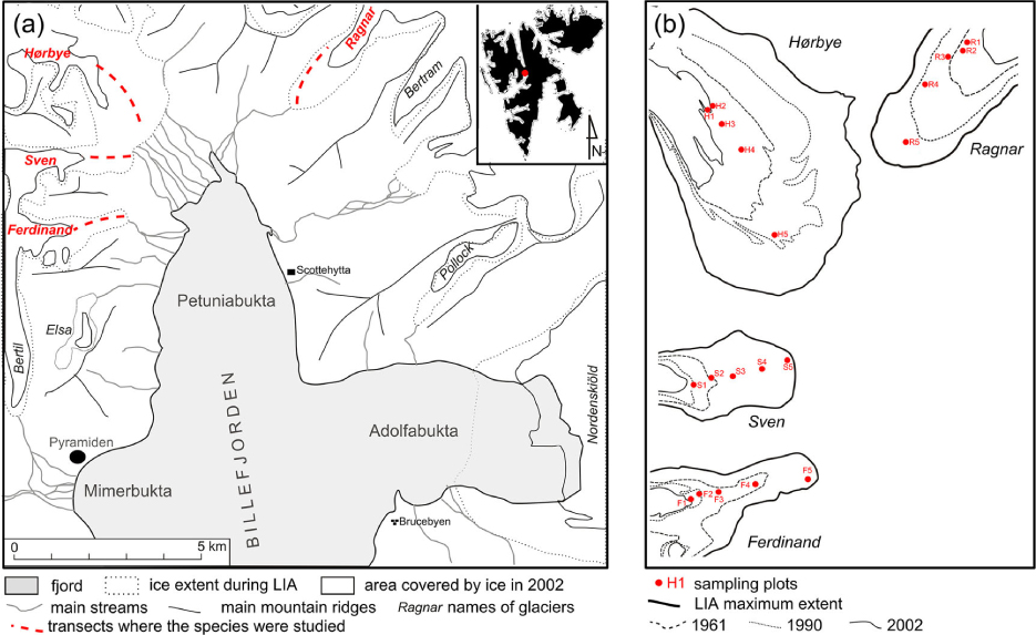 (a) Map of studied area of Petuniabukta. The studied glacier forelands are marked with dashed lines. The inset shows the location of northern Billefjorden on the island of Spitsbergen. (b) The glacier forelands involved in the study with reconstructed positions of glacier foreheads since the Little Ice Age (LIA) maximum (based on Rachlewicz et al. 2007). The red circles depict positions of the study sites.