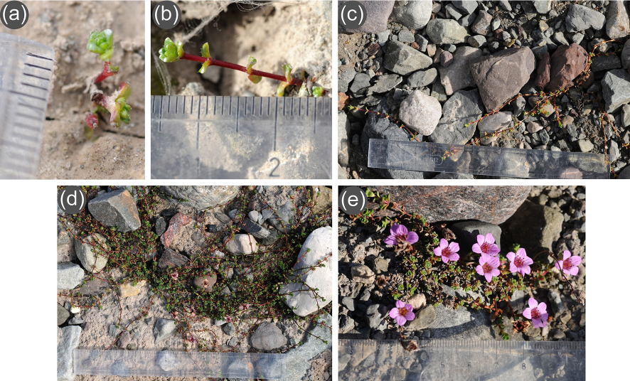 Saxifraga oppositifolia (Saxifragaceae) and Braya purpurascens (Brassicaceae) have been reported as pioneer species in glacier foreland succession in Svalbard (Hodkinson et al. 2003; Moreau et al. 2008; Nakatsubo et al. 2010; Prach & Rachlewicz 2012). Saxifraga oppositifolia holds its position up to late stages of succession and is common in old growth tundra. In contrast, B. purpurascens is frequent in initial stages of succession, but its abundance decreases in later stages, becoming limited to disturbed places in old growth tundra (Moreau et al. 2008; Prach et al. 2012).
