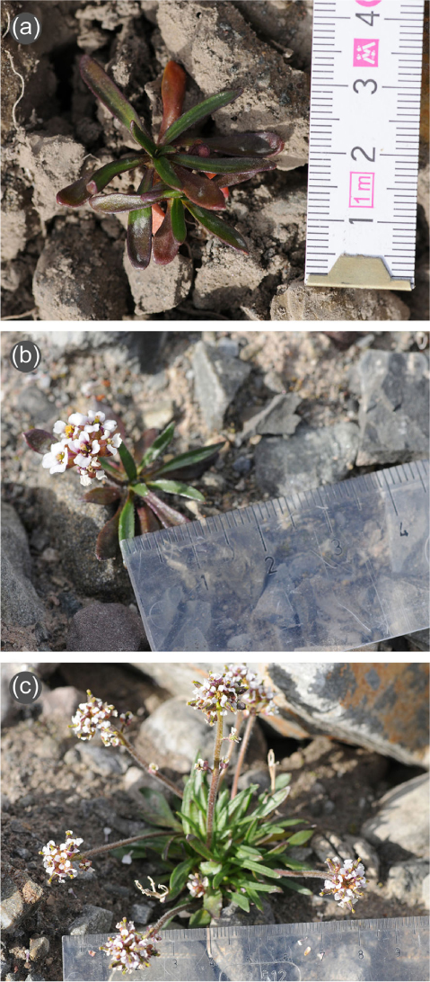 Variation in shoot size and architecture of Braya purpurascens plants growing on the Hørbye glacier foreland: (a) a sterile plant with two rosettes (9 years since deglaciation); (b) flowering single-rosette (FS) plant (11 years since deglaciation); (c) flowering plant with multiple rosettes and inflorescences (11 years since deglaciation).