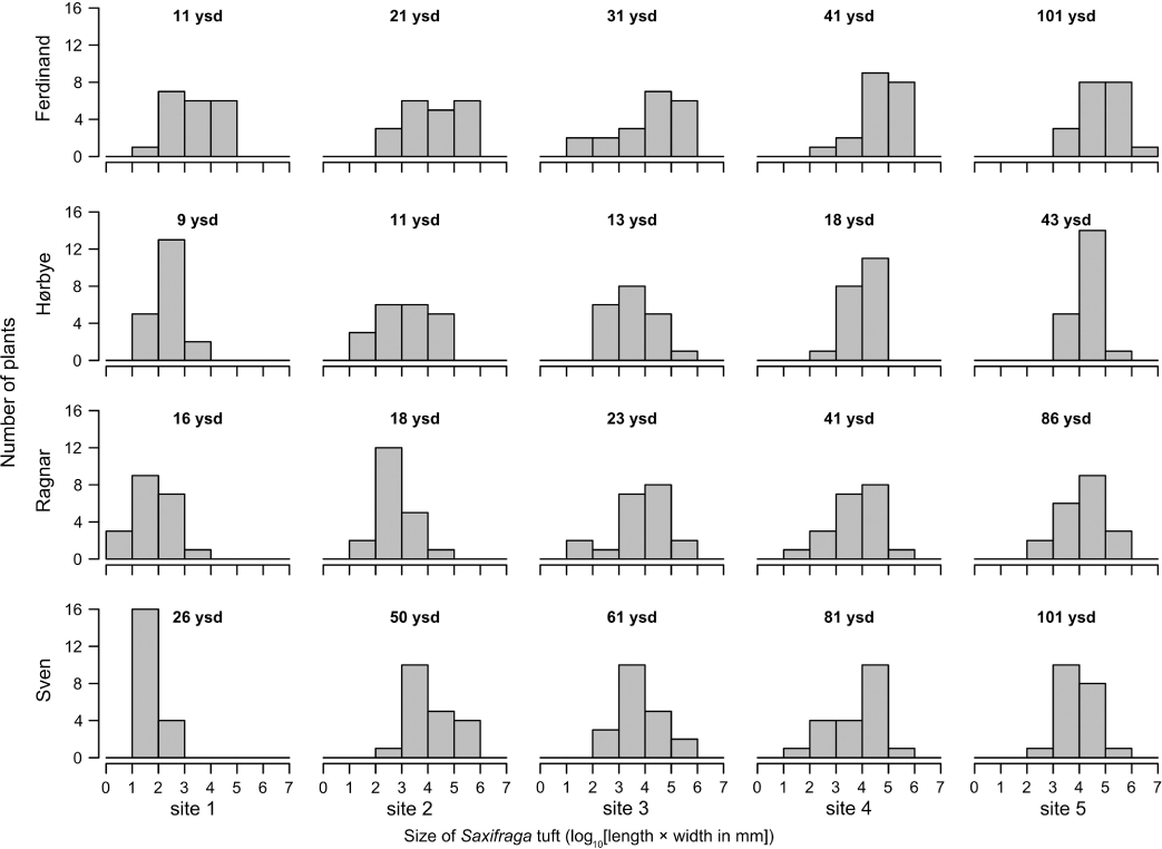 The estimated start of colonization varied among the forelands (Table 1). At young sites (9–26 years since deglaciation), S. oppositifolia plants were just simple shoots a few centimetres long. These small seedlings (Fig. 2a; size less than two on the log-scale corresponding to cover ca. 1 cm2) were frequent at most sites younger than 20 years (Fig. 4). Only rarely did these plants also occur at older sites (Ragnar foreland: sites 2 and 3 with two and one individuals, respectively; Sven foreland: site 4 with one individual). Small sterile plants (Fig. 2b; size between two and three on the log-scale, corresponding to cover of ca. 1–10 cm2) were common. They were most frequent at young sites and were absent at the oldest sites of Ferdinand and Hørbye forelands. Plants of intermediate size (Fig. 2c; size between three and four on the log-scale, corresponding to cover of ca. 10–100 cm2) were common along the whole gradients with the exception of Hørbye, Ragnar and Sven youngest sites. Large plants (Fig. 2d, e; size larger than four on the log-scale corresponding to cover exceeding ca. 100 cm2) were common or prevailing at older sites but were still present in low numbers at most of the youngest sites. The proportion of flowering individuals in the populations increased with age since deglaciation (Table 2). Plants growing on the youngest sites were always sterile, with sparse flowering recorded at slightly older sites (ca. 20 years since deglaciation). Approximately 50% of the plants were flowering at sites older than 50 years.