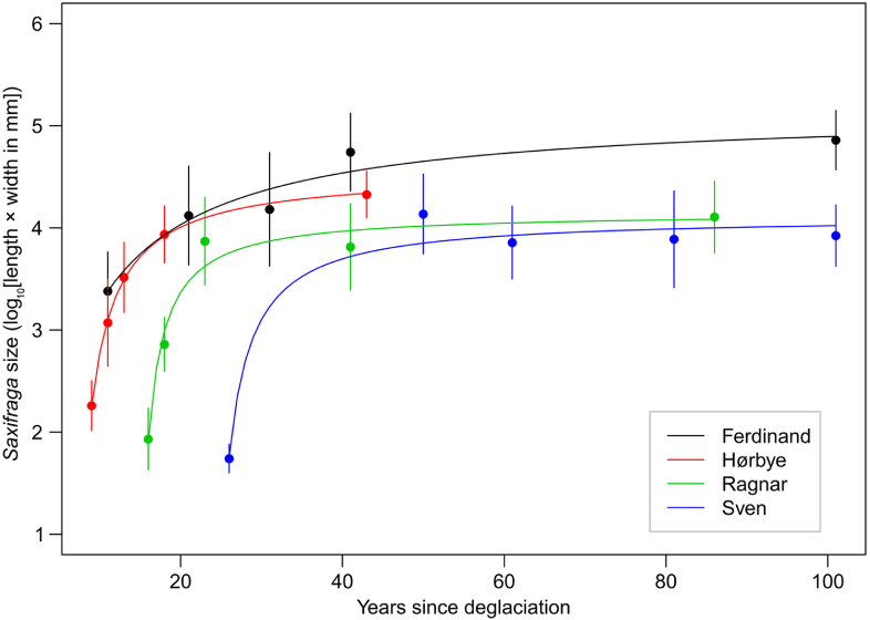 Patterns of Saxifraga oppositifolia size on the gradients of the age since deglaciation. Filled points represent mean values within study sites; error bars represent one standard error. See Table 1 for summaries of non-linear models describing the relationship between S. oppositifolia size and the years elapsed since deglaciation.