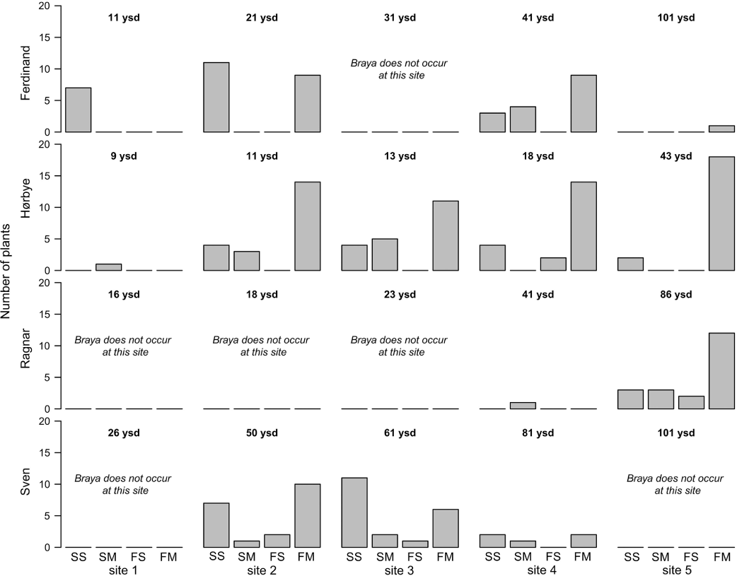 Bar-plots displaying population structure of Braya purpurascens at individual sites on the glacier forelands under study. Each glacier foreland is represented by a row of plots. Braya purpurascens plants were classified to following classes: sterile single rosette (SS), sterile multiple rosettes (SM), flowering single rosette (FS) and flowering multiple rosettes (FM). Reconstructed ages—expressed as years since deglaciation (ysd)—are given for each site. Contingency table-based tests of differences in population structure between sites within forelands: Ferdinand: χ2=17.4, df=4, p<0.002 (sites 1, 2 and 4 were only considered, FS category was omitted due to absence at site), Hørbye: χ2=17.7, df=9, p<0.05 (sites 2–4 were considered), Ragnar not tested due to representative population occurring only at site 5, Sven: χ2=3.7, df=6, p=0.71 (sites 2–4 were considered).