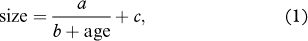 where a, b and c are parameters defining the shape of the relationship and age is the site age since deglaciation as derived from Rachlewicz et al. (2007). The size was log10-transformed prior to the analysis. This model assumes a greater size difference between plots in the young part of the age gradient than in the old part and an asymptote to which size will converge with the age. The asymptote is represented by the parameter c of the model. In addition, the projected intercept of the hyperbola with the x-axis (i.e., estimated age of the colonization start; back-transformed size 100=1 mm2) is fitted by the model and corresponds to age0=−a/c−b. Reproductive status of both S. oppositifolia and B. purpurascens was analysed by binomial generalized linear models. The demographic population structure of B. purpurascens, based on numbers of plants differing in reproductive status (flowering vs. sterile) and number of rosettes (single vs. multiple), was visualized by bar-plots and analysed by goodness-of-fit test as contingency tables where possible. All statistical analyses were conducted in R version 2.13.2 (R Development Core Team 2011).