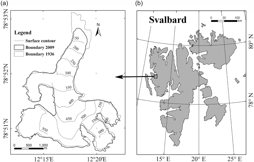 We are very grateful to the anonymous reviewers whose useful comments significantly improved the clarity and presentation of our results. This work was supported by the Chinese Polar Environment Comprehensive Investigation & Assessment Programmes, the National High Technology Research and Development Program of China (2012AA12A304), the National Natural Science Foundation of China (41076126, 41106163, 41174029, 41176172) and the Chinese Polar Scientific Strategy Project (20080203, 20100103). The authors thank the Chinese Arctic and Antarctic Administration, State Oceanic Administration, for sponsoring the field surveying and research works around Chinese Arctic Yellow River Station. Special thanks go to Roger W. Hagerup and Jack Kohler from the Norwegian Polar Institute for their help finding the historical maps for this area. We also thank to Dr Adrian Fox from the British Antarctic Survey for polishing the English of this paper.