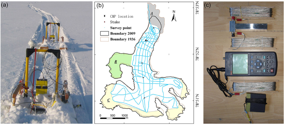 The main GPR unit used was the pulseEKKO PRO (Sensors & Software, Mississauga, ON, Canada). 100 MHz antennas were chosen to survey on Pedersenbreen also during April 2009. Two antennas were placed horizontally on two all-wood sledges separated by 4 m, and dragged slowly behind a snowmobile so that the two antennas were parallel to each other and perpendicular to the profiling direction. The integrated GPS was fixed to the first sledge connecting with the GPR receiver (Fig. 2a). The GPR traces with synchronous GPS coordinates were collected at one-second frequency. Each GPR trace had a time window of 2.8 µs, which was stacked four times and composed of 3500 samples. In total, 16 400 traces were collected, which summed to 45.7 km of distance (Fig. 2b). It is of high density such that the average distance between two neighbouring traces was about 3 m.