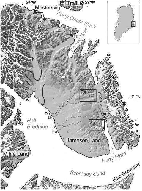 Map of Greenland and the Scoresby Sund–Jameson Land area. The open squares mark our study areas (see Fig. 2). The filled triangle represents the Mestersvig delta and the filled circles with roman numbers the positions of radiocarbon samples (see Table 2 for site numbers). Thick black lines represent Milne Land Stade moraines as described by Funder (1970) in Milne Land and by Denton et al. (2005) north of Hall Bredning. The following river names are abbreviated: Depotelv (De), Draba Sibirica Elv (Dr), Lollandselv (Lo) and Falsterselv (Fa) rivers. Copyright background map: National Survey and Cadastre, Denmark.