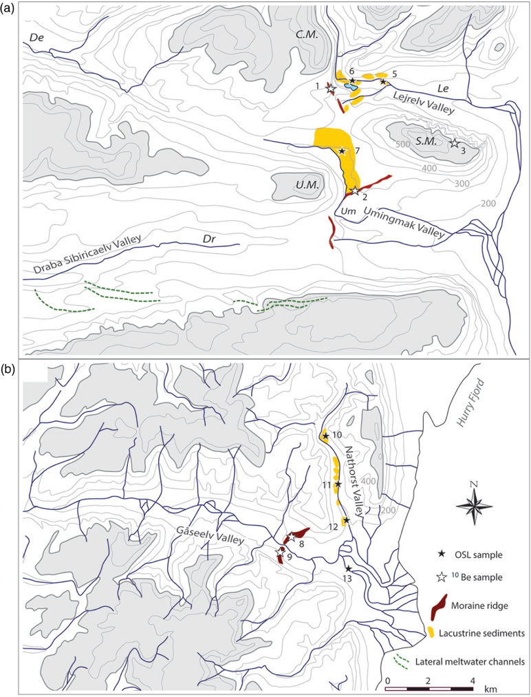 Maps showing the study areas: (a) the Lejrelv area (contour interval of 50 m); (b) the Gåseelv area (contour interval of 100 m). The bold line marks the 500 m contour and light grey areas show terrain above 500 m a.s.l. Stars mark the sites from which samples for 10Be (white) and optically stimulated luminescence (OSL; black) dating have been taken and numbers refer to site numbers (Table 1). The geomorphological features are based on the maps by Lilliesköld & Salvigsen (1991) and our field survey. Topographic information is from copyright, National Survey and Cadastre, Denmark. The following river names are abbreviated: Depotelv (De), Draba Sibirica Elv (Dr), Lejrelv (Le) and Umingmelv (Um). The following names of mountains are abbreviated: Centralbjerg (C.M.); Skansen (S.M.) and Umingmak (U.M.).
