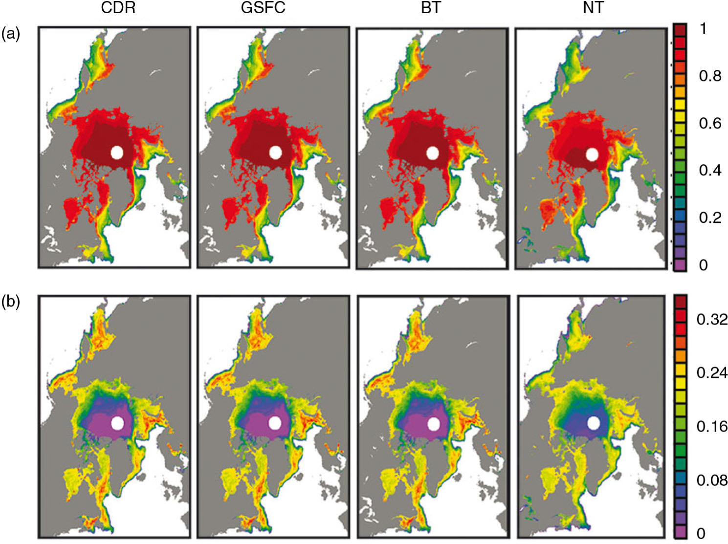 Spatial distribution of 20 years (1988–2007) (a) mean and (b) standard deviation (SD) of monthly sea-ice concentrations from the National Oceanic and Atmospheric Administration Climate Data Record (CDR), Goddard Space Flight Center (GSFC), Bootstrap (BT) and NASA Team (NT) algorithms in the Northern Hemisphere. Units are fraction ice concentration (0–1). Grid cells with sea-ice concentrations less than 0.15 (15%) are not included in the calculations.