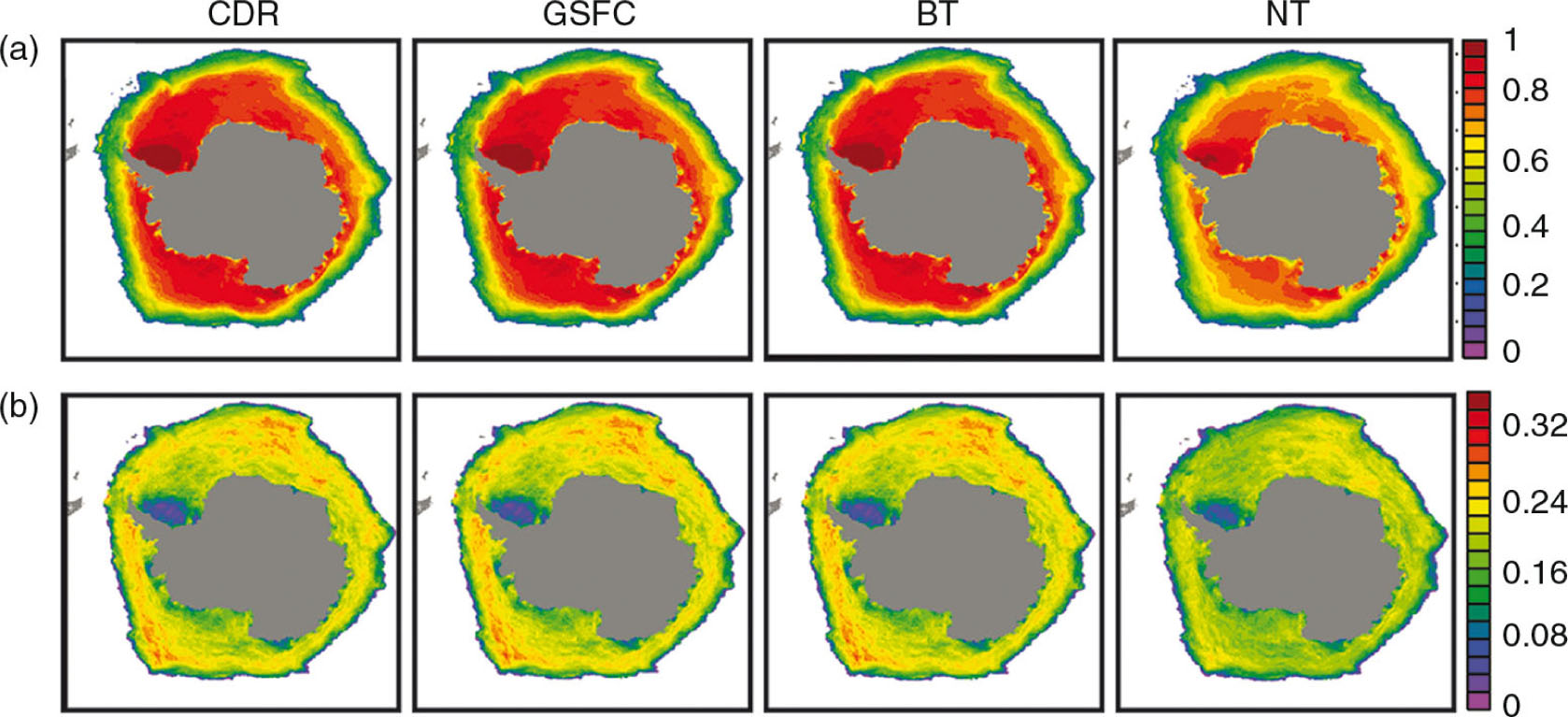 Spatial distribution of 20 years (1988–2007) (a) mean and (b) standard deviation (SD) of monthly sea-ice concentration from the National Oceanic and Atmospheric Administration Climate Data Record (CDR), Goddard Space Flight Center (GSFC), Bootstrap (BT) and NASA Team (NT) algorithms in the Southern Hemisphere. Units are fraction ice concentration (0–1). Grid cells with sea ice concentrations less than 0.15 (15%) are not included in the calculations.