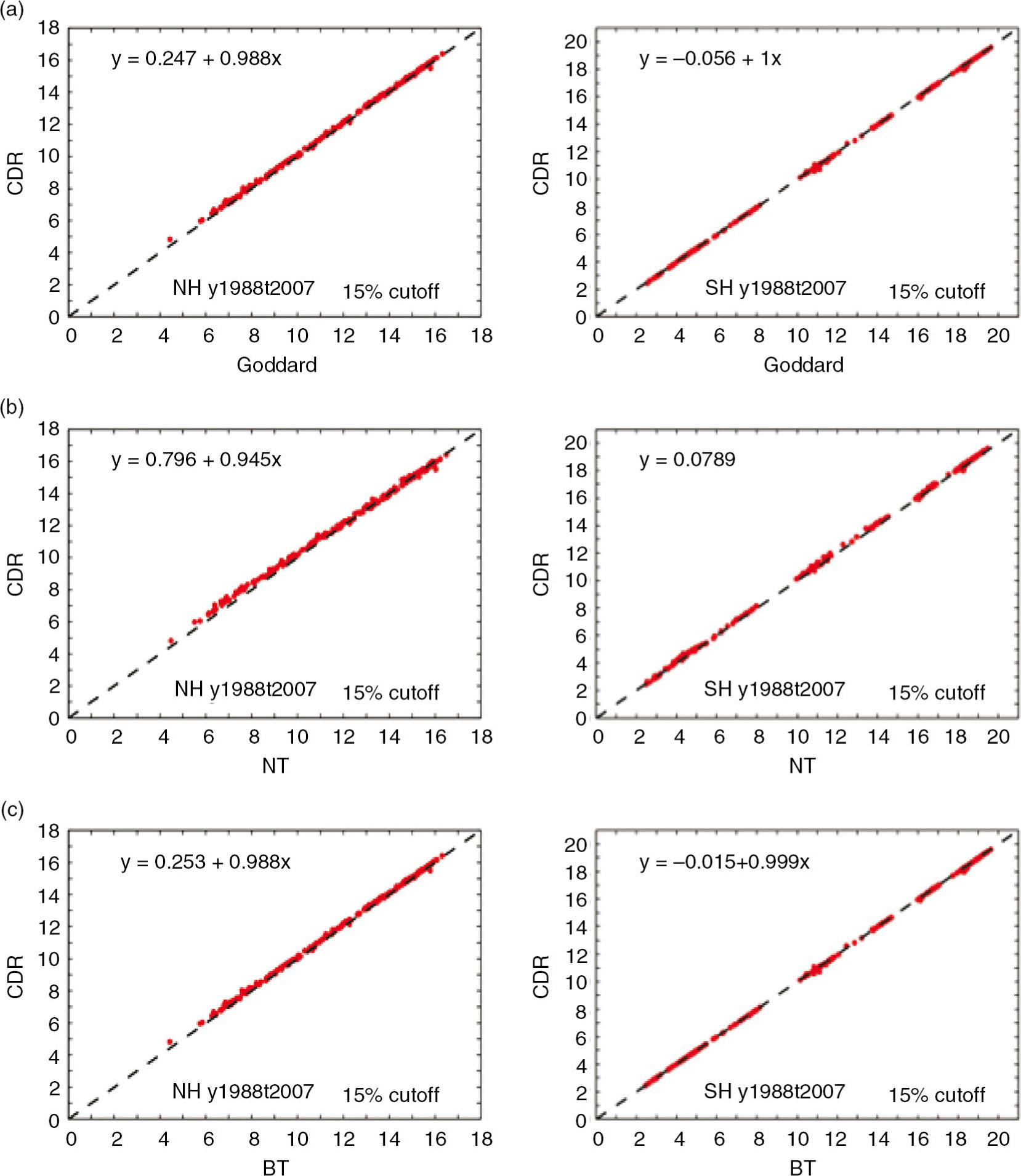 The scatter diagram of monthly sea ice extents (106 km2) from monthly National Oceanic and Atmospheric Administration Climate Data Record (CDR) and (a) Goddard Space Flight Center, (b) NASA Team (NT) and (c) Bootstrap (BT) data. The left column of diagrams is for the Northern and the right is for the Southern Hemisphere.