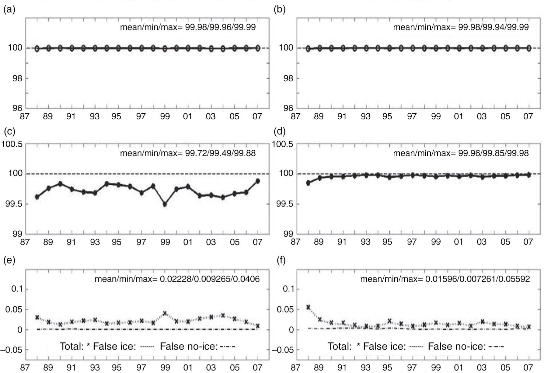 Temporal evolution of (a) and (b) accuracy, (c) and (d) precision, (e) and (f) false/incorrect classification of the National Oceanic and Atmospheric Administration Climate Data Record (CDR parameter in (a), (c) and (e) March and (b), (d) and (f) September for the Northern Hemisphere for the period of years 1988–2007. A 15% concentration cut-off is used to delineate ice and no-ice classification and missing grid cells are not included. The mean, minimum and maximum monthly values over the entire 1988–2007 period are given at the top of each plot.