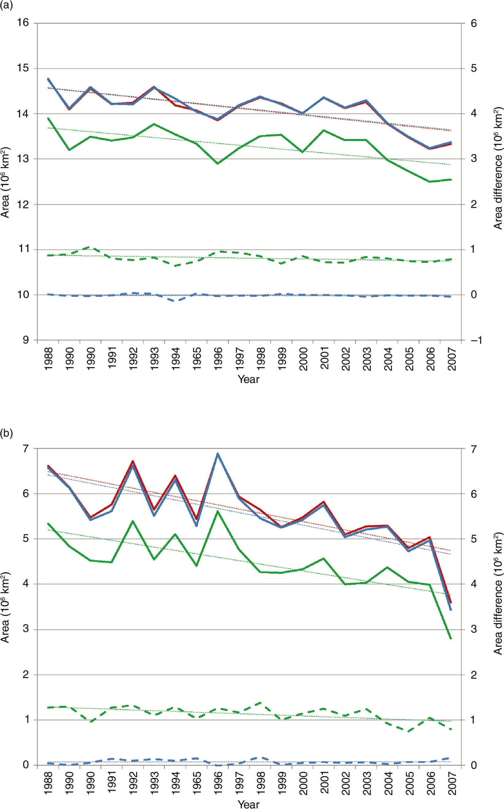Time series of monthly Northern Hemisphere the National Oceanic and Atmospheric Administration Climate Data Record (CDR) (a) extent and (b) area for 1988–2007 (thick solid lines: blue for March and red for September) and difference between CDR and Goddard Space Flight Center estimates (dashed lines). Note the different y axis scales for the extent/area (left axis) and the differences (right axis). The dotted lines are linear trends.