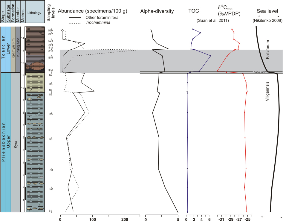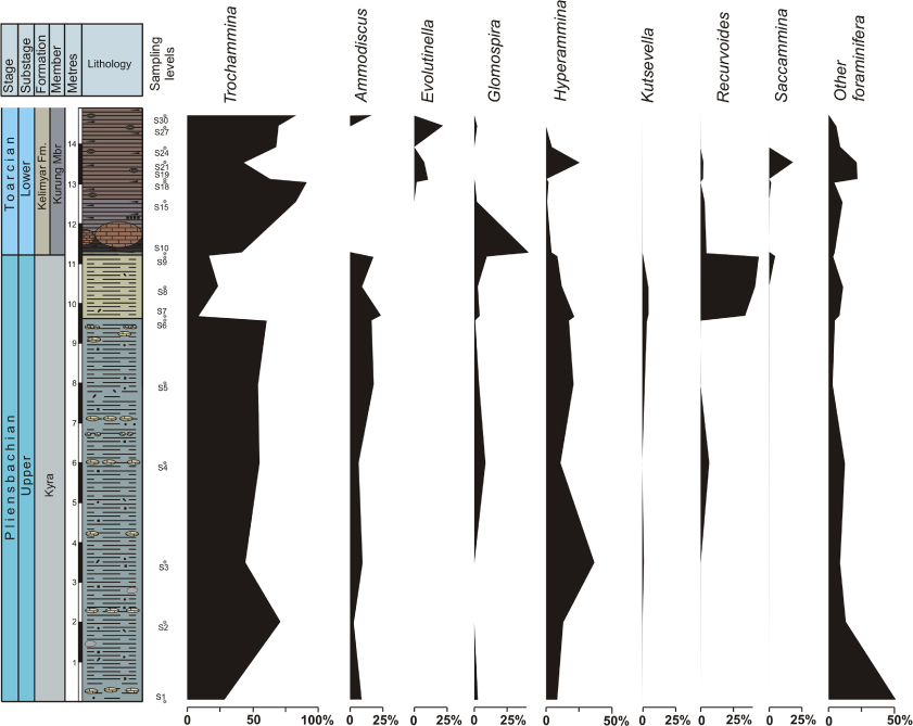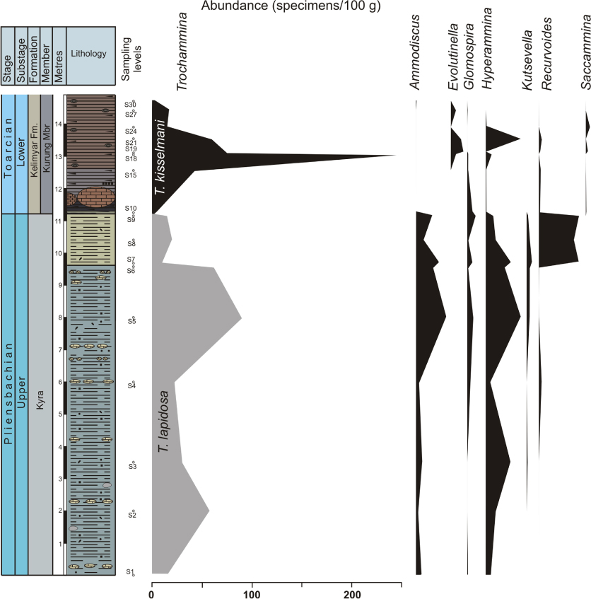 Episodes featuring a higher proliferation of Trochammina may be related to: (a) sea-level fall and consequent changes in salinity in the Arctic Palaeobasin during the Margaritatus Chron and the beginning of the Viligaensis Chron (Late Pliensbachian), and (b) restricted oxygen biofacies (hypoxic conditions) related to the T-OAE.