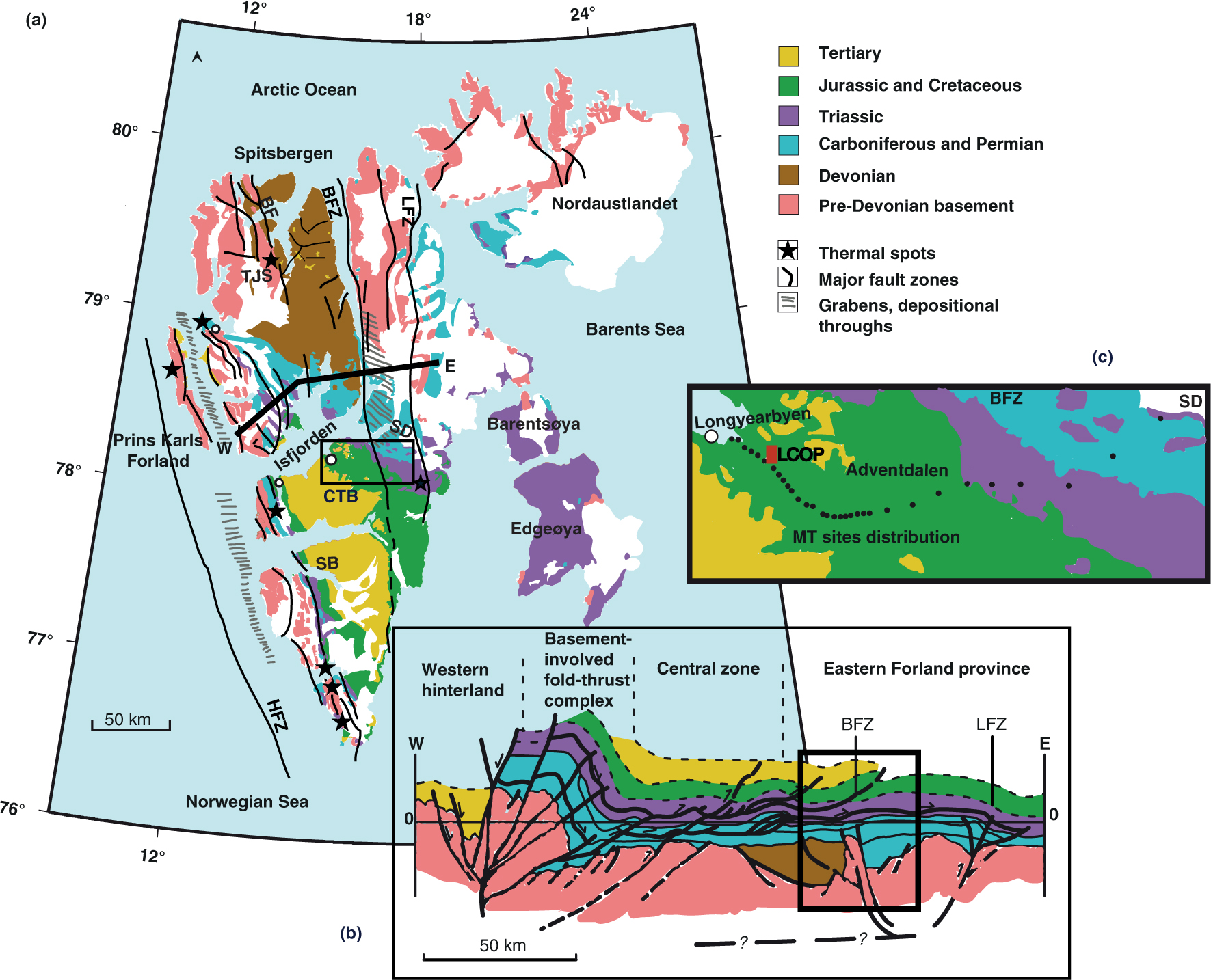 (a) Geo-tectonic map of Svalbard redrawn from Dallmann et al. (2002). (b) Schematic regional scale cross-section in a west–east transect across north–central Spitsbergen redrawn from Bergh & Grogan (2003). The portion of the cross-section that is marked by a rectangle corresponds to the magnetotelluric (MT) result shown in Fig. 3b. (c) Station distribution for the measured MT profile, indicated by the rectangle in (a). Geological and other features are abbreviated as follows: Lomfjorden Fault Zone (LFZ); Billefjorden Fault Zone (BFZ); Breibogen Fault (BF); Hornsund Fault Zone (HFZ); the warm springs Trollkildene and Jotunkildene (TJS); Central Tertiary Basin (CTB); Sysselmannbreen (SB); Sassendalen (SD); Longyearbyen CO2 Lab’s well park (LCOP).