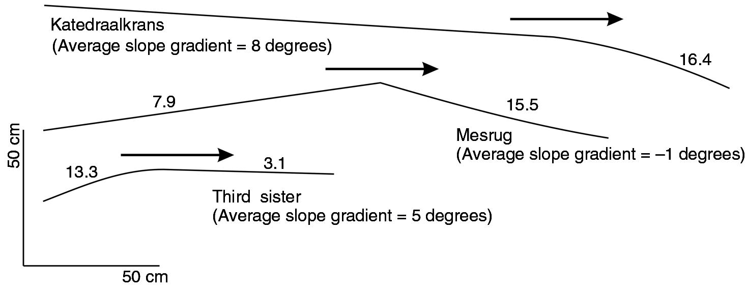 Most of the landform segments sampled display poor sorting and are positively skewed (Table 1). Briggs (1977) indicates that a positively skewed distribution is one in which greater amounts of fine material occur. The skewness data presented in Table 1 indicates that, in relative terms, a greater percentage of fines can be found in the lee of the Mesrug and Third Sister landforms. Cumulative percentages of particle size indicate that the risers of the forms at Third Sister and Katedraalkrans comprise the coarsest material whereas the crests of the landforms at Mesrug comprise the coarsest material (Fig. 2). These findings can be associated with the predominant wind direction observed at each site.