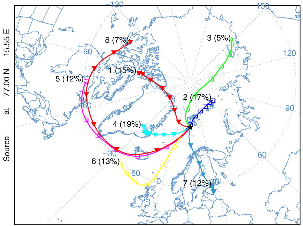 The air mass origin for the Polish Polar Station at Hornsund was modelled with HYSPLIT (Draxler & Hess 1997; Draxler & Rolph 2003; Draxler 2004; Draxler et al. 2009), using seven-day (i.e., 168-hour) backward air mass trajectories at 1000 m a.s.l., based on the Global Data Assimilation System meteorological data set. The trajectory elevation was chosen to avoid the influence of local topography, which, in a test run of the model, strongly disturbed the trajectories arriving at 500 m a.s.l. Rozwadowska et al. (2010) indicated that even trajectories at 1000 m a.s.l. were still influenced by the topography, being located within the boundary layer. However, these were less influenced than 500 m a.s.l. trajectories, and coincided with the typical cloud elevation, which is an important factor in the assessment of pollution sources for precipitation. The trajectories were produced for days with precipitation events, at three-hour intervals, and clustered into eight groups. Cluster analysis was performed using Ward’s method, as described by Stunder (1996).