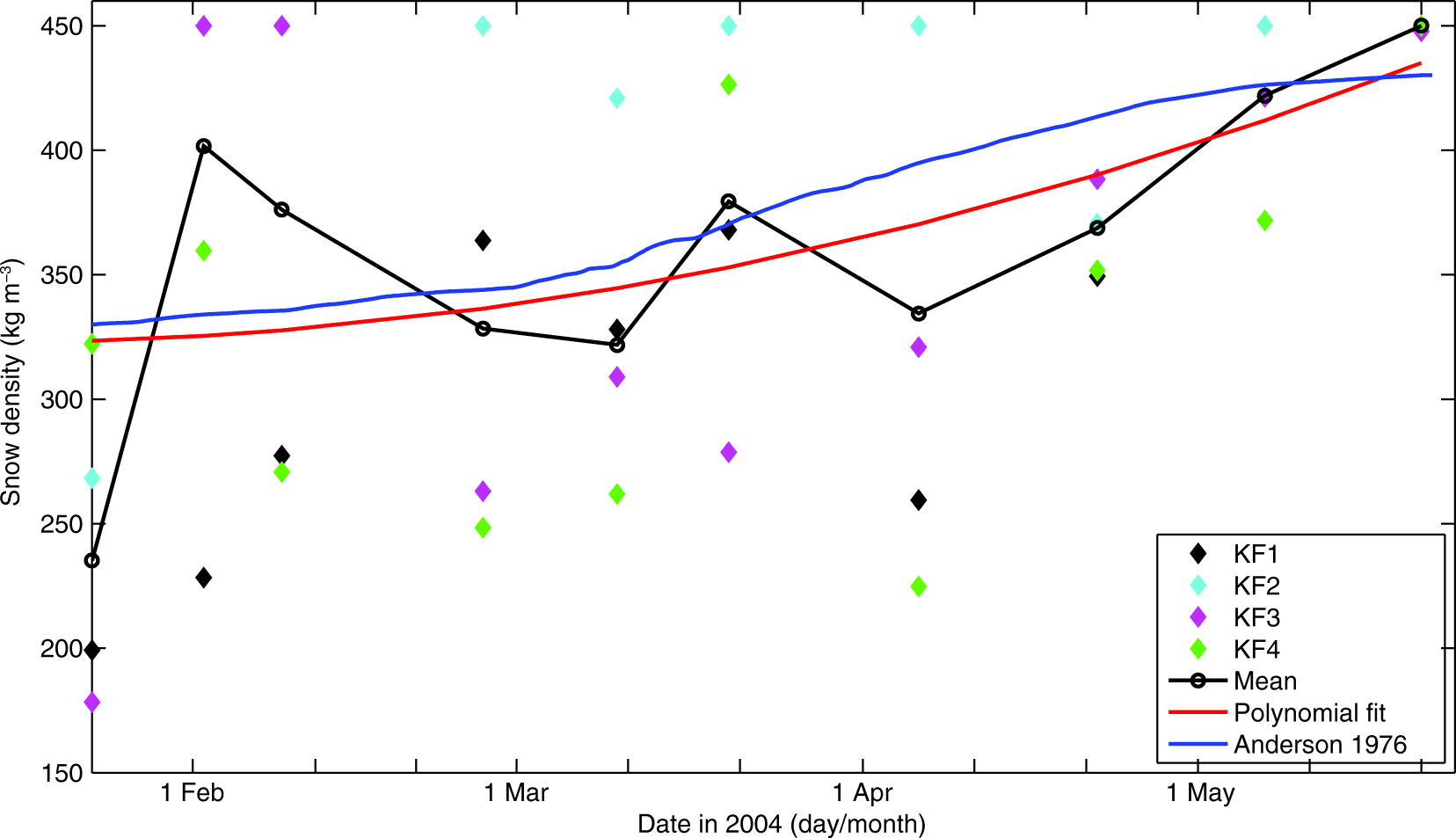 Calculated snow density (coloured symbols) based on individual snow and ice thicknesses and freeboard measurements at sites KF1–KF4 according to Archimedes’ Principle. The calculated mean snow density (black line with open circles), the polynomial (n=2) fit (red line) in a least-squares sense of mean snow density and the parameterized snow density in accordance with Anderson (1976) (blue line) are also shown.