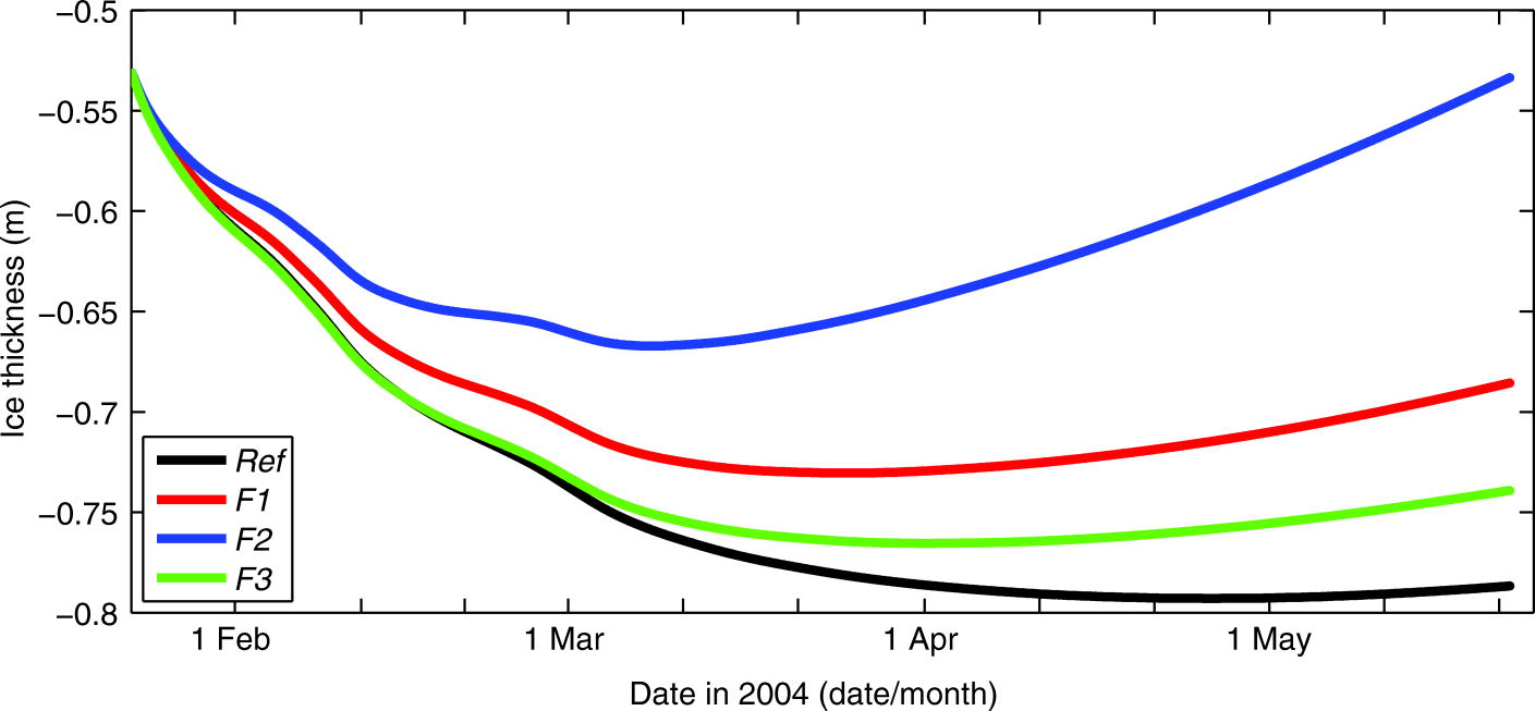 Oceanic heat flux affected the ice bottom evolution. Figure 7 shows the ice bottom changes in experiments Ref and F1–F3. With larger oceanic heat flux, there was less ice bottom accretion and more ice bottom ablation in Kongsfjorden. During the simulation period, sea ice at the ice bottom grew 25 cm in experiment Ref and 16 cm in experiment F1, while the growth (13 cm) and melting cancelled each other in experiment F2. In experiment F3, the calculated oceanic heat flux gradually increased from 2 W m−2 in early February to roughly 8 W m−2 towards the end of the simulation period. The modelled ice growth at the ice bottom in experiment F3 did not differ significantly from experiment Ref before 1 March. Afterwards, there was less ice growth and more melting at the ice bottom in experiment F3 compared with experiment Ref, since the penetration of solar radiation made more energy available at the ice bottom.