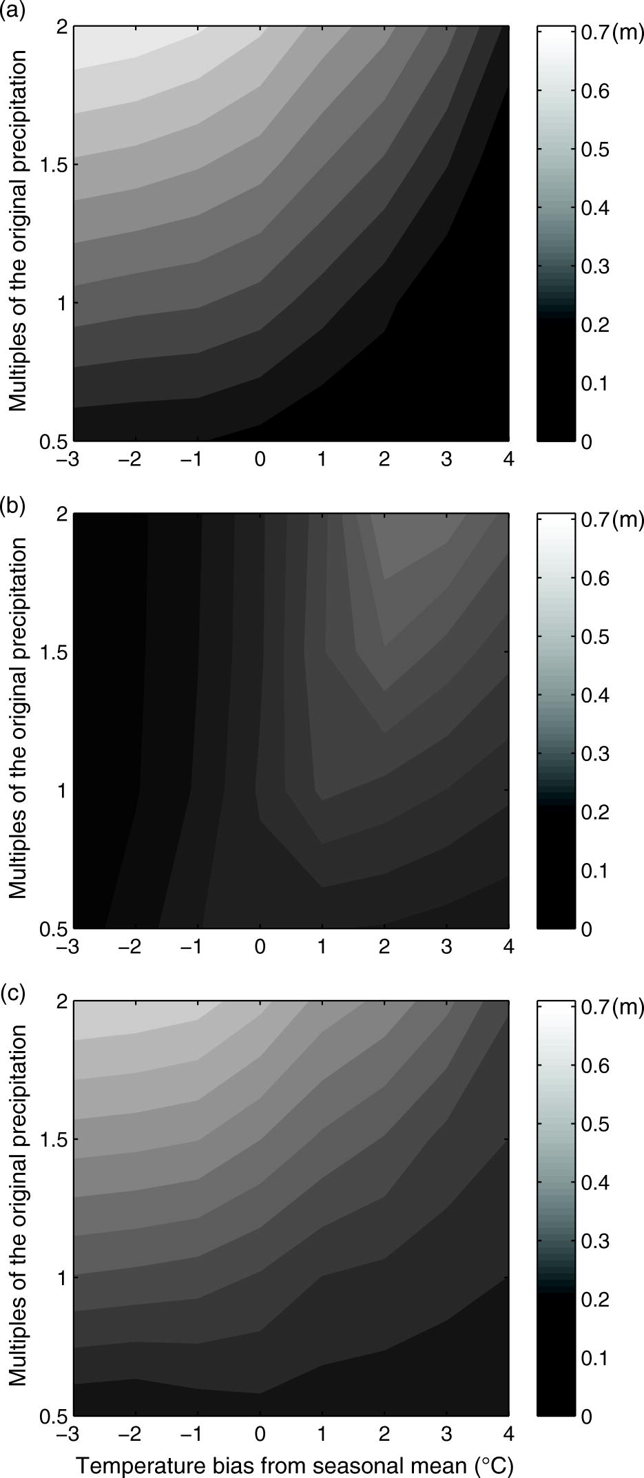 The effect of temperature or precipitation on snow ice and superimposed ice can be investigated by simple model sensitivity experiments. With the reference model run (Ref) conditions, an increase in seasonal mean air temperature by 1°C could reduce the modelled maximum ice thickness by 5 cm, meaning roughly 5% reduction of the total ice thickness. An increase in the total precipitation by 50% could result in 15 cm more maximum ice thickness in the reference run due to ice formation at the ice surface. The effect of temperature and precipitation on maximum slush formation due to flooding, melting as well as maximum snow to ice transformation was demonstrated by a number of model experiments forced with different combinations of air temperature and precipitation (Fig. 9). Under cold conditions, the slush formation due to flooding was almost linearly proportional to the total available precipitation. With the large precipitation scenario, the formation of slush due to flooding was sensitive to temperature changes. The slush formation due to melting was less sensitive to precipitation in cold conditions and more sensitive in warm conditions. The formation of slush due to melting was also sensitive to temperature changes when there was a great deal of seasonal precipitation. The total granular ice formation was more sensitive to precipitation than the temperature.