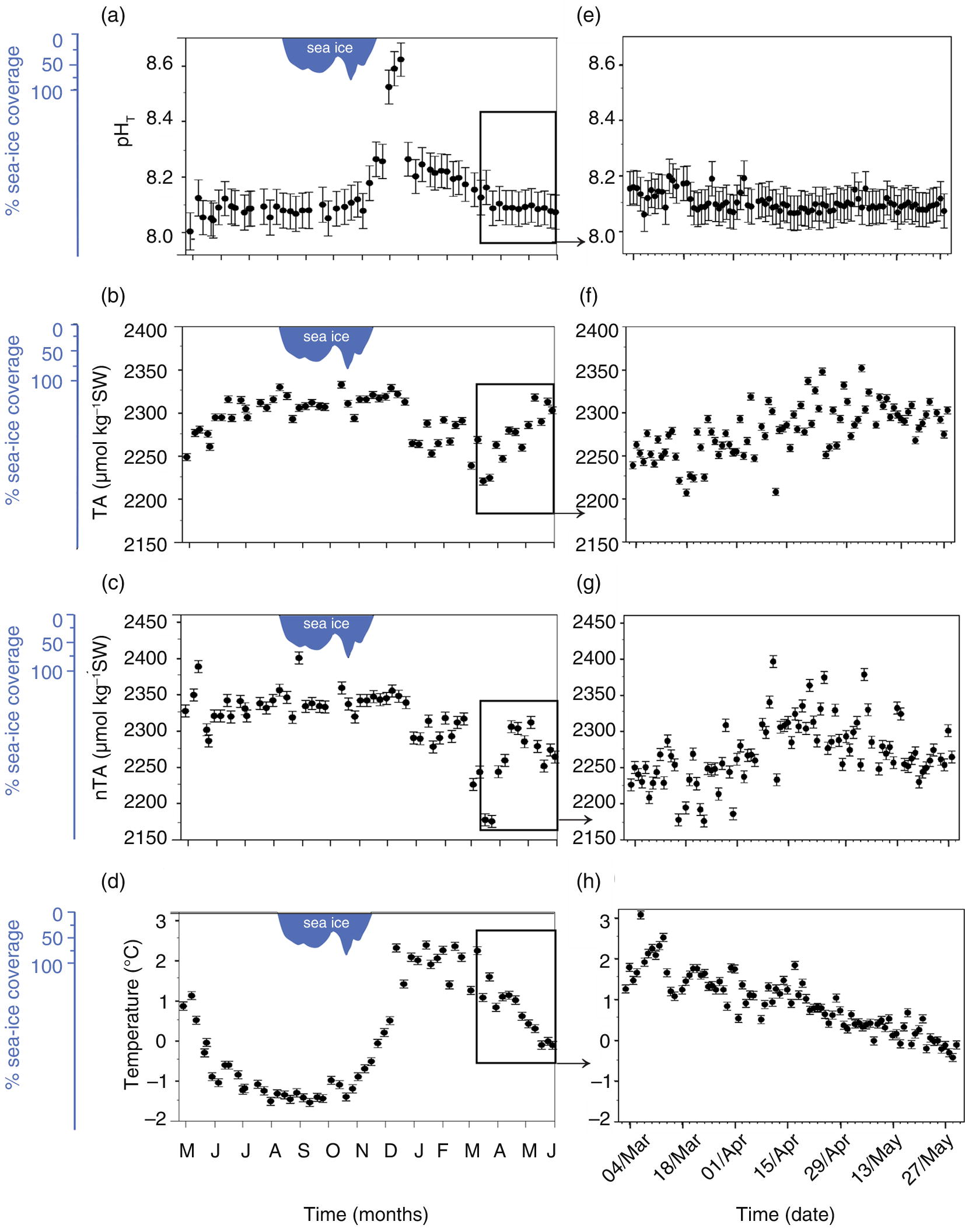 The retreat of annual sea ice has been linked to a greater intensity of phytoplankton blooms in coastal regions of the western Antarctic Peninsula (Ducklow et al. 2013). This increased seasonal productivity is attributed to increases in both sea-ice-melt water and light availability (Vernet et al. 2008; Ducklow et al. 2013). In the present study, we detected a strong increase in seawater pH in late November, a likely signal of increased primary production attributable to sea-ice break-out. Similarly, Montes-Hugo et al. (2010) found that increased levels of chl a, indicative of greater phytoplankton biomass, corresponded with a depletion of DIC during the spring sea-ice retreat along the central Antarctic Peninsula. Alterations in carbonate chemistry and TA during periods of high austral spring and summer primary production were observed in the present study. Biological activity is the most likely driver of the observed seasonal variations in seawater nTA and associated carbonate system chemistry.