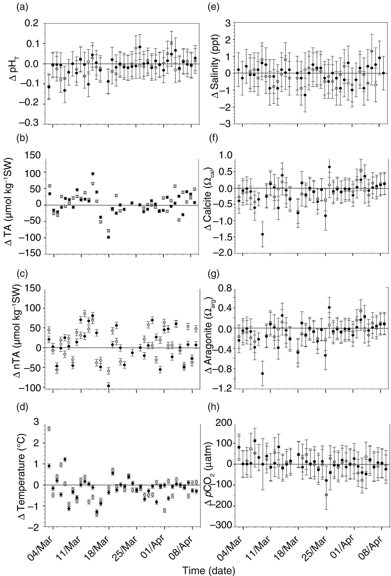 Semidiurnal measurements of carbonate chemistry indicated that the frequency of the direction of net change in Ωcal (Fig. 3f, Supplementary Table S2) and Ωarg (Fig. 3g, Supplementary Table S2) calculated for day or night were significantly different (2×3 contingency table, X2=10.5, df = 2, P=0.01 for both Ωcal and Ωarg). However, the saturation states displayed substantial variability within a given day (max day ΔΩcal=1.42, ΔΩarg=0.90; Supplementary Table S2) and generally less variation over the night (max night ΔΩcal=0.72, ΔΩarg=0.45; Supplementary Table S2). There was also substantial semidiurnal variation in pCO2 (max Δday=112, Δnight=146 µatm; Supplementary Table S2) but no distinct pattern of differences between day and night (Fig. 3h, Supplementary Table S2) or significant difference in the frequency of the direction of net change in pCO2 based on the time of observation (2×3 contingency table, X2=4.9, df = 2, P=0.08).
