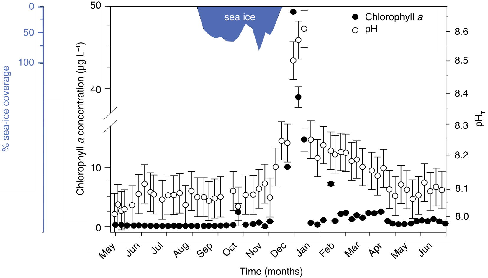 Comparison of dynamics of chl a concentrations and pH measured from the immediate vicinity of Palmer Station by month for one year (May 2012–May 2013, compiled from the Palmer LTER Data Repository). Maximum sea-ice coverage was 76%. Error bars represent measurement uncertainties.