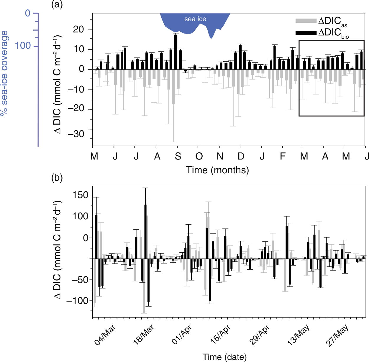 Drivers of daily dissolved inorganic carbon (DIC) variation calculated for annual and daily DIC (ΔDICas and ΔDICbio). Negative values represent a decrease in DIC between repeat measurements while positive values denote an increase. (a) Drivers of DIC annual variations in DIC computed over the course of one year (May 2012–May 2013, mean ΔDICobs±mean uncertainty, −0.003±0.89 mmol m−2 d−1). Maximum sea-ice coverage over the course of this year was 76%. (b) Drivers of DIC daily variations in DIC computed for daily measurements were performed for the last three months of the observation period (March–May 2013, mean ΔDICobs±mean uncertainty, 0.85±0.96 mmol m−2 d−1). Error bars represent measurement and propagated uncertainties associated with each parameter.