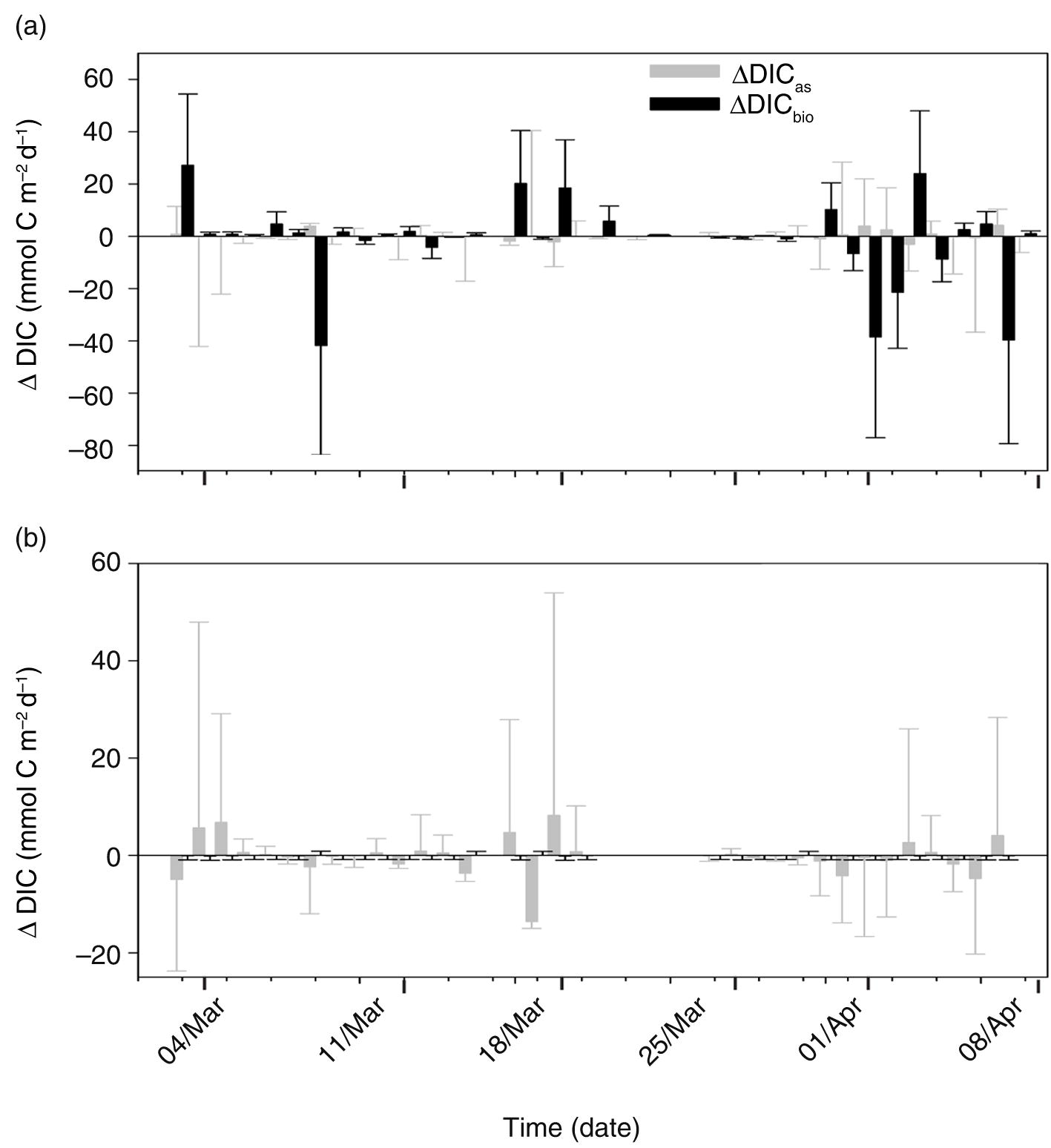 We utilized this method based on the assumption that the sea ice present during a given sampling period acted as an effective barrier to air–sea CO2 exchange (Bates 2006; Roden et al. 2013). The variation in DIC due to biological processes (ΔDICbio) was estimated by calculating the difference between ΔDICobs and ΔDICas (Eqn. 2).