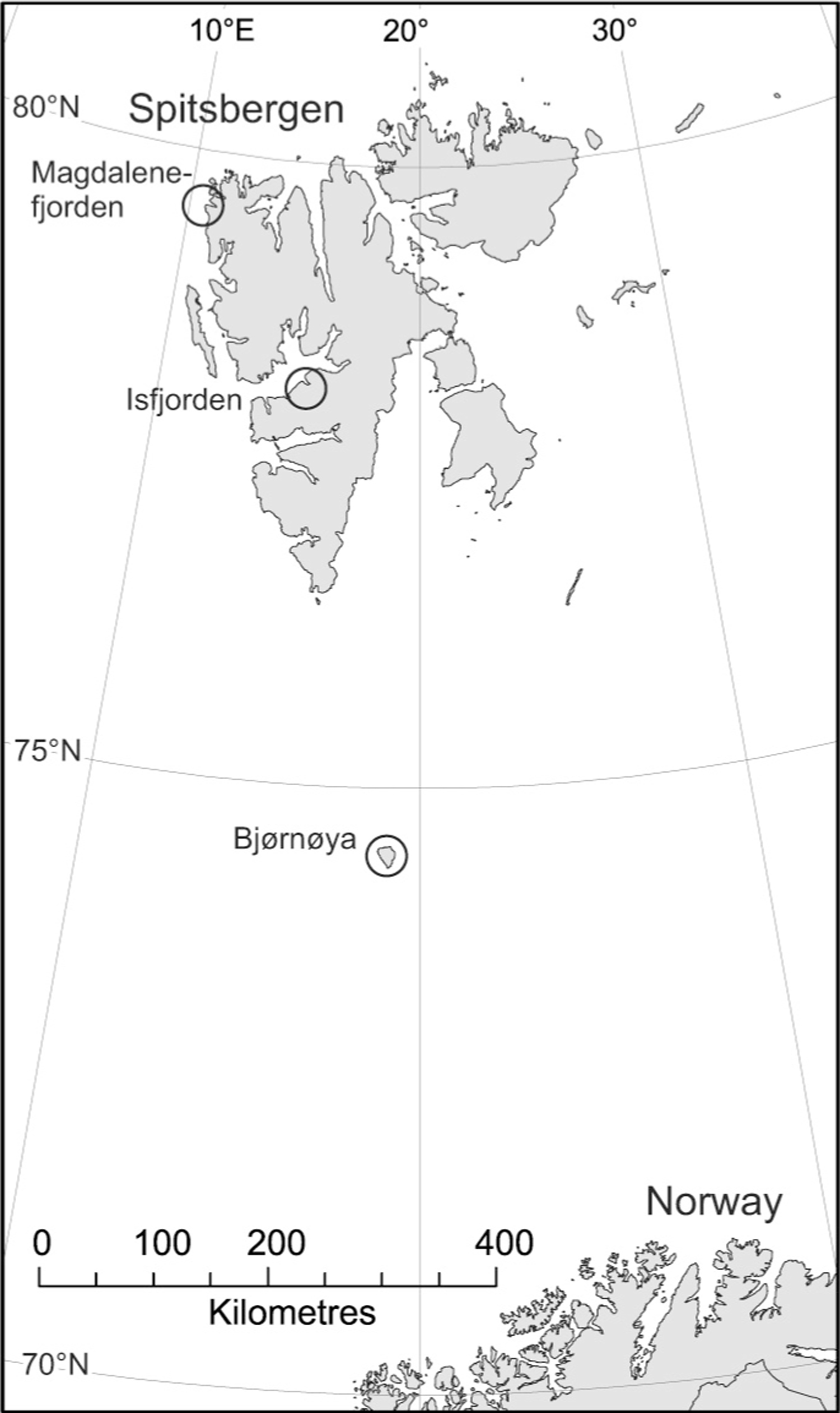 Study area locations within the Svalbard Archipelago.