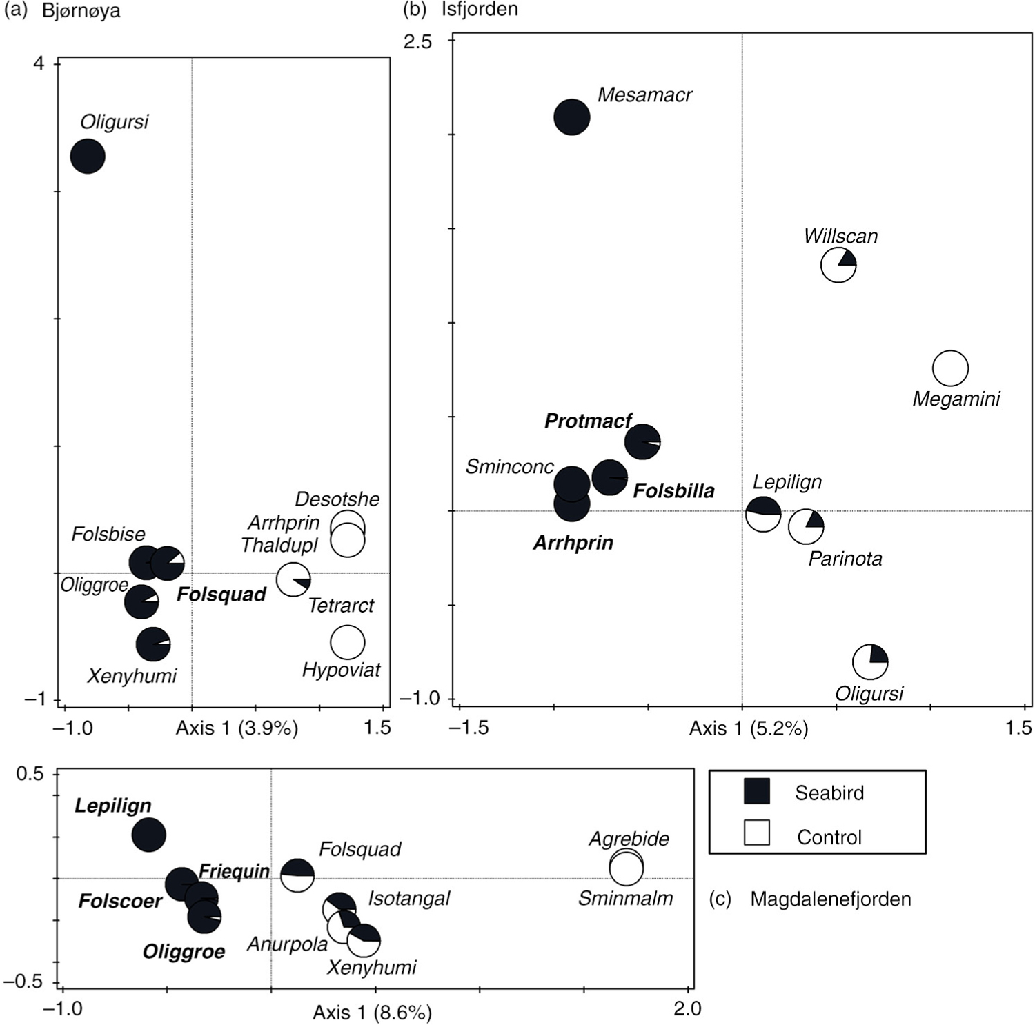 Canonical correspondence analysis (CCA) ordinations of 10 best-fitted species with respect to the SEABIRD factor (axis 1) in each area. Pie slices based on species percentage occurrence within SEABIRD (black) and CONTROL (white) sites. Boldface indicates species that significantly and positively react to the SEABIRD explanatory variable (on the basis of t-value biplot).
