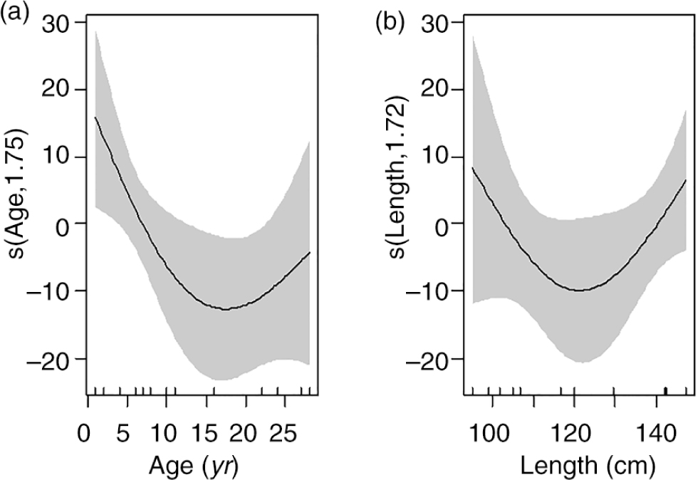 Smoothing functions (k=3) of general additive modelling on the size of Arctic cod consumed by ringed seals in relation to age (a) and length (b). The y axes represent the smoothing function centred at zero and the estimated degrees of freedom for each explanatory variable. The adjusted R2 for this model is 0.47. The dark line represents the overall mean, shaded areas are 95% confidence intervals, and small lines on the x axes are observations at each predictor level.