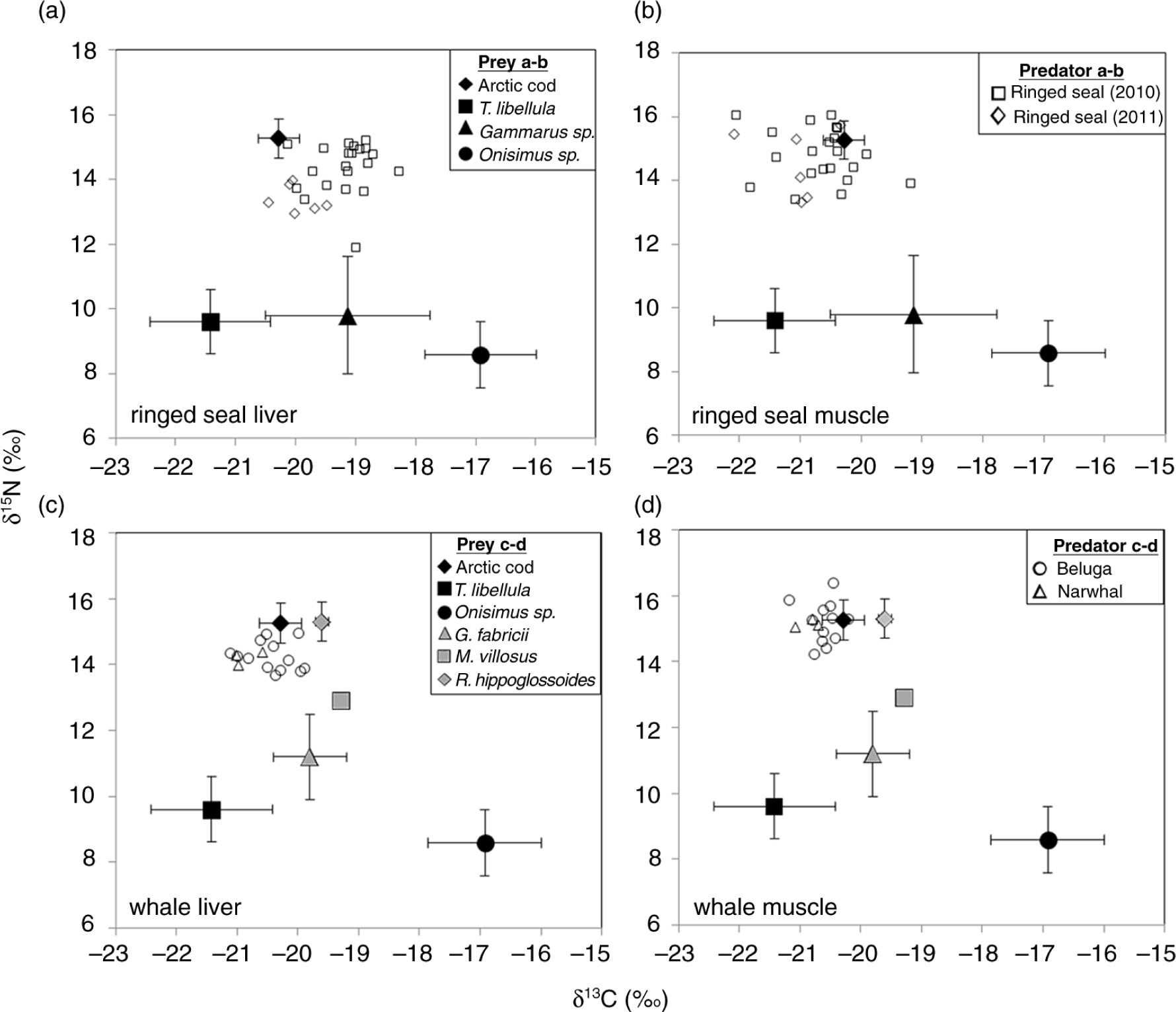 Isotope biplot of potential prey sources (mean±SD) of ringed seals, belugas and narwhals, corrected for trophic discrimination by subtracting 3.1 and 0.6‰ from ringed seal values for liver δ15N and δ13C, respectively, as well as 2.4 and 1.3‰ for muscle (Hobson et al. 1996). The discrimination factors used for the toothed whales were 2.78 and 1.27‰ for liver δ15N and δ13C, respectively, and 1.23 and 1.26‰ for muscle (Caut et al. 2011). Prey were collected from Allen Bay in 2010, except for the following species: Gonatus fabricii and Reinhardtius hippoglossoides collected in Davis Strait in 2011 (Watt & Ferguson 2015) and Mallotus villosus collected in Cumberland Sound 2008 (Dennard et al. 2009).