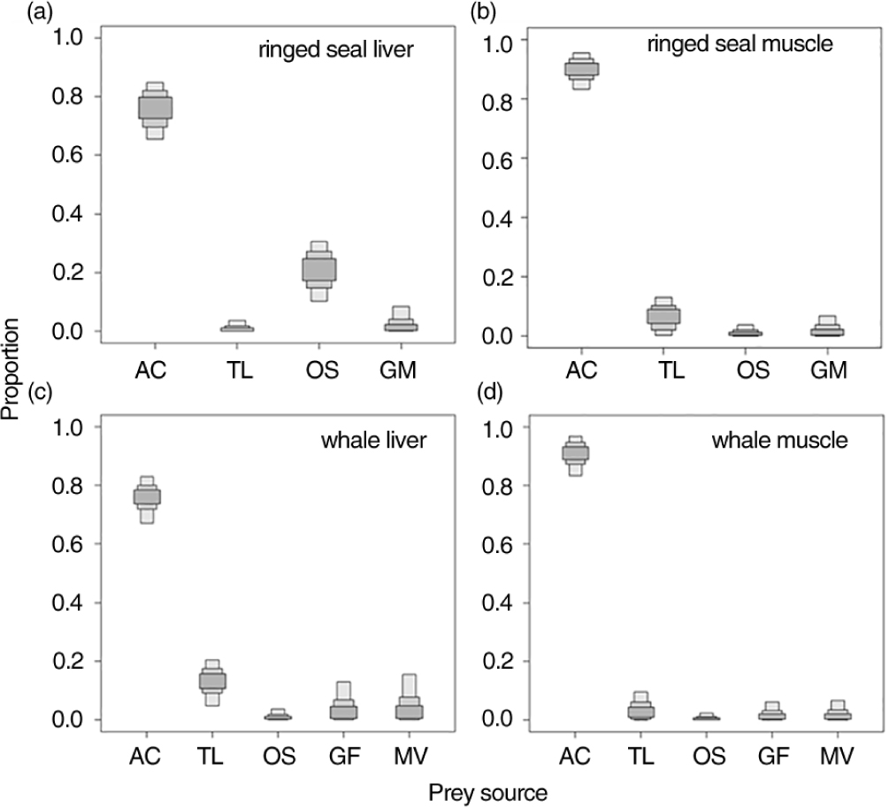 Contribution of common prey sources based on isotopic mixing model output for ringed seal and toothed whale (belugas and narwhals combined) liver and muscle from 2010. Prey sources used in the models were Arctic cod and/or Reinhardtius hippoglossoides (AC), Themisto libellula (TL), Onisimus sp. (OS), Gammarus sp. (GM), Gonatus fabricii (GF) and Mallotus villosus (MV). The boxplots represent probability densities for credibility intervals of 95% (lighter boxes), 75%, and 50% (darker boxes).