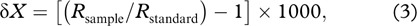 where X is 15N or 13C, Rsample is the ratio (15N/14N or 13C/12C) in the sample and Rstandard is the ratio in the standard. The standard deviation of samples run in triplicate was generally <0.1‰ (δ13C) and <0.2‰ (δ15N).