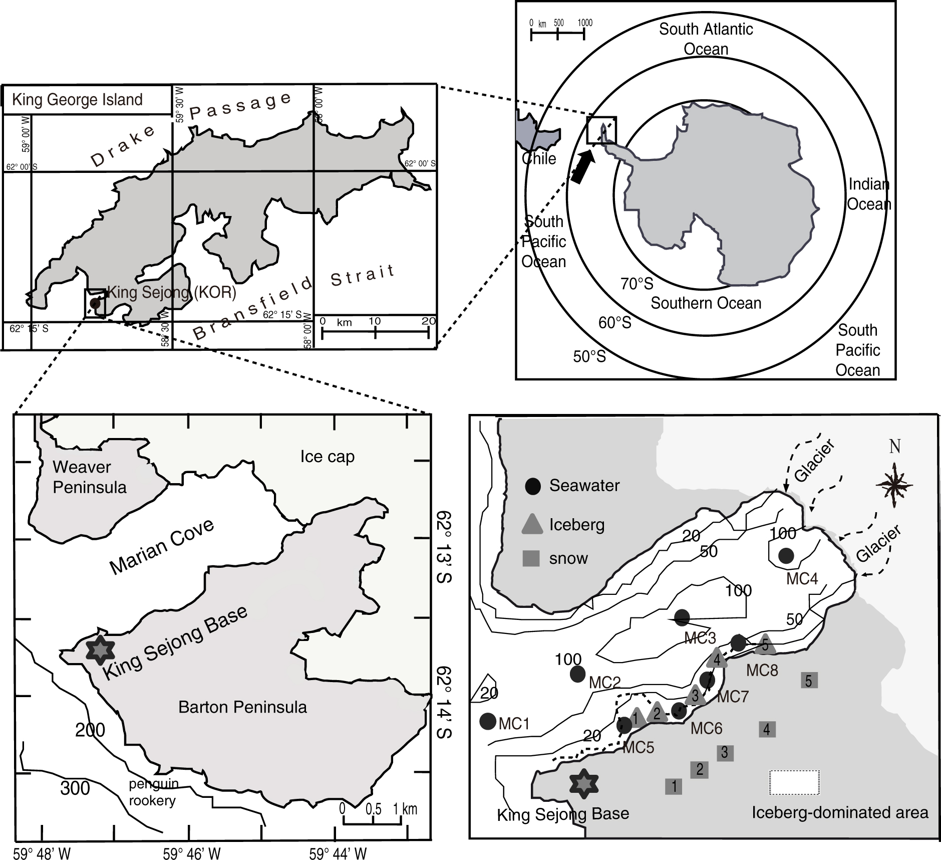 The main objectives of this study are (1) to determine the distribution of dissolved trace elements including Fe and rare earth elements (REEs), dissolved inorganic nitrogen (DIN), phosphorous (DIP), silicate (DSi) and dissolved organic carbon (DOC) in ice floats, snow and coastal seawater and (2) to quantify trace elements and chemical components derived from Antarctic glacier melts in a coastal embayment. This study was conducted at Marian Cove, which is located south of the Antarctic Polar Front (Fig. 1). It was selected as an ideal place to study the impacts of glacial melt on coastal waters because glacier valleys drain into Marian Cove and deliver large volumes of turbid glacier meltwater (GMW) during the austral summer (Shim et al. 2011).