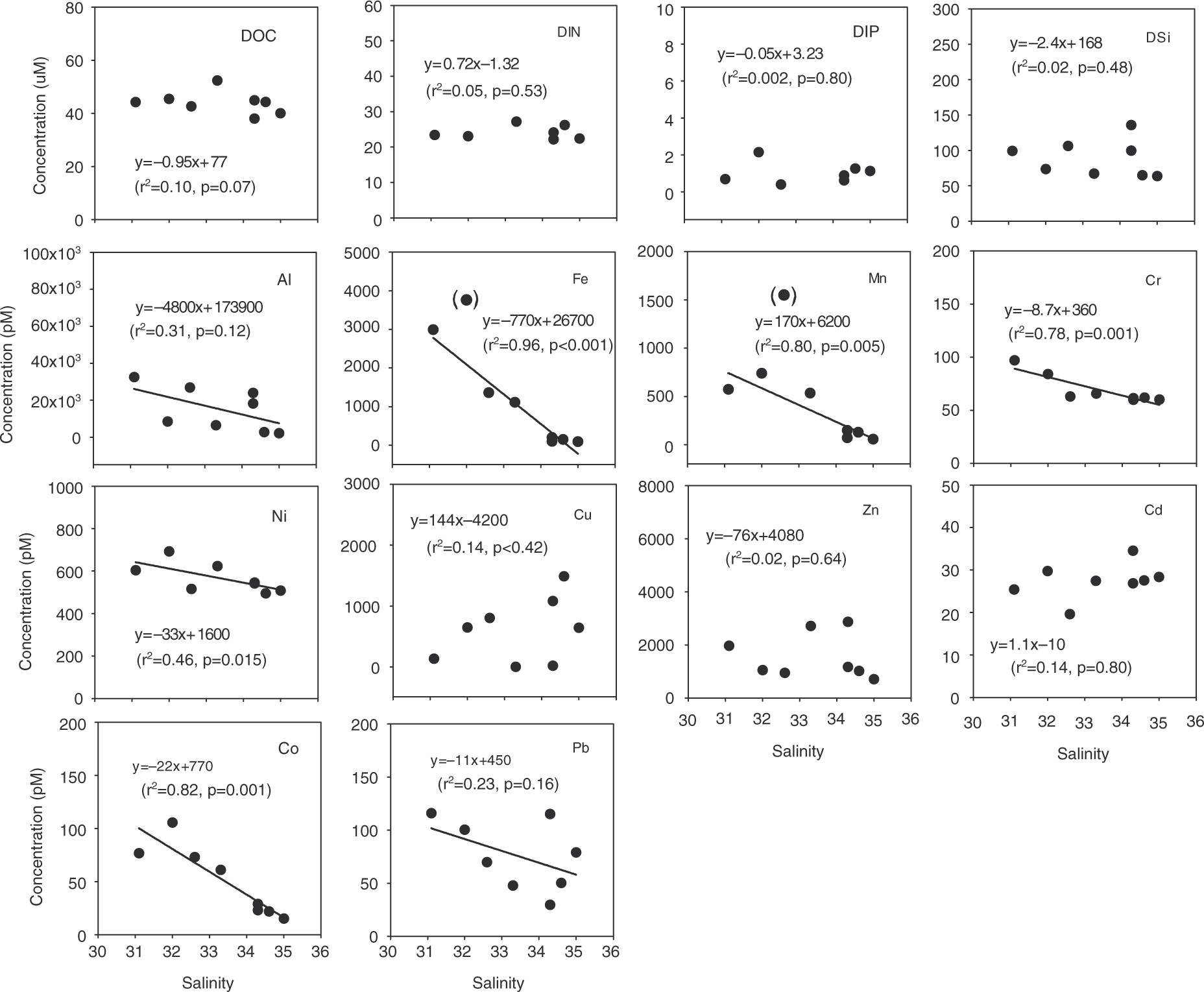 The concentrations of trace elements (Al, Cr, Mn, Fe, Co, Ni, Cu, Zn, Cd, Pb and REEs) in bay seawater are also listed in Tables 2 and 3. The concentrations of most trace elements (Al, Mn, Fe, Co, Cu, Zn, Cd, Pb and REEs) were found to be within the range of those reported from the major oceans (Westerlund & Öhman 1991; Sanudo-Wilhelmy et al. 2002; Saito et al. 2010), whereas those of Cr and Ni were an order of magnitude lower than those in the oligotrophic Southern Ocean (Fitzwater et al. 2000; Hendry et al. 2008). In general, Cd showed a good correlation with phosphate in the oceans (de Baar et al. 1994), with a