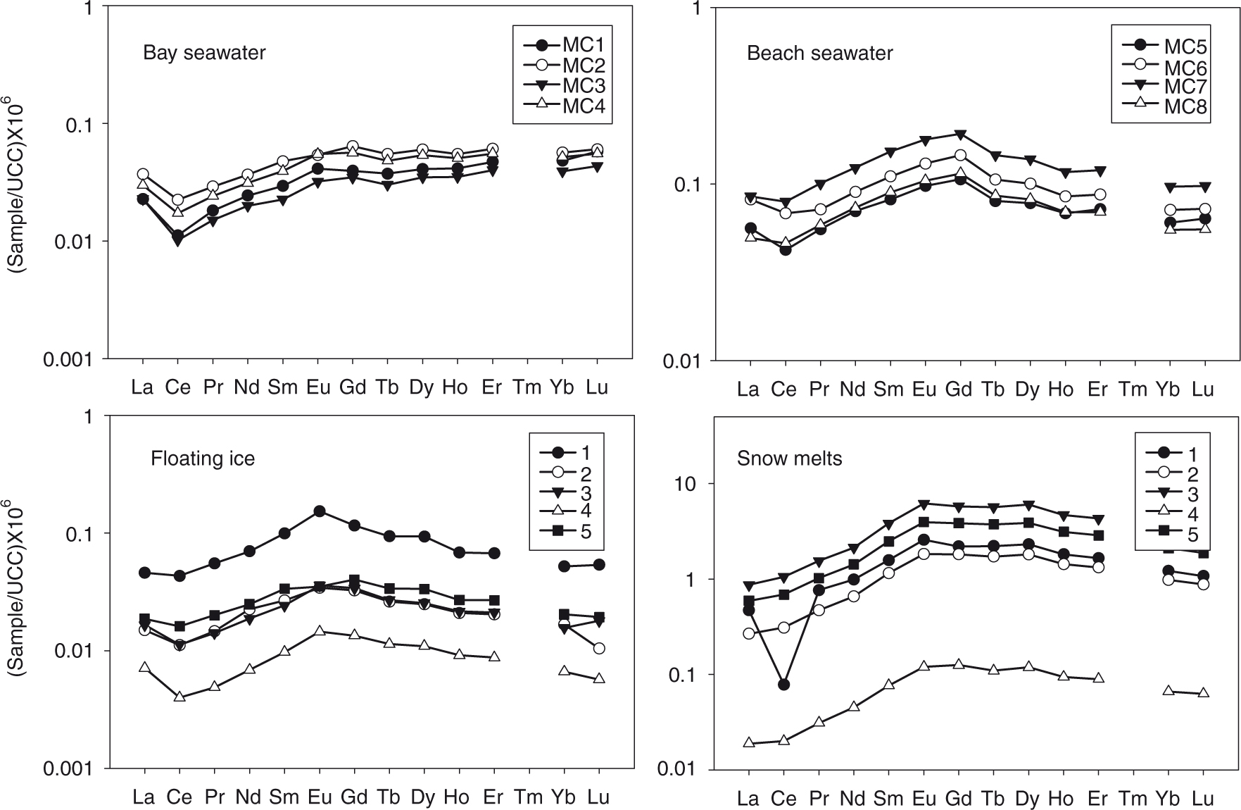 Upper continental crust (UCC)-normalized rare earth element patterns in ice, snow and seawater (beach seawater + bay water) samples from Marian Cove.