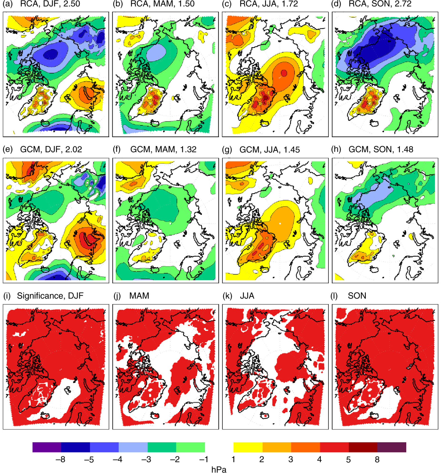 Sea-level pressure (SLP) bias compared to the reanalysis data set by the European Centre for Medium-range Weather Forecasts (ERA-interim) for the period 1980–2005 in (a–d) the ensemble mean of Rossby Centre Atmosphere model (RCA) downscalings of global models (GCM) and (e–h) the ensemble mean of the global models. The projections are based on RCP8.5. The numbers in the titles (a–h) indicate the model area averaged root mean square error (in hPa). Red areas in (i–l) mark areas where the SLP biases in regional and global simulations are significantly different (at the 95% confidence level).