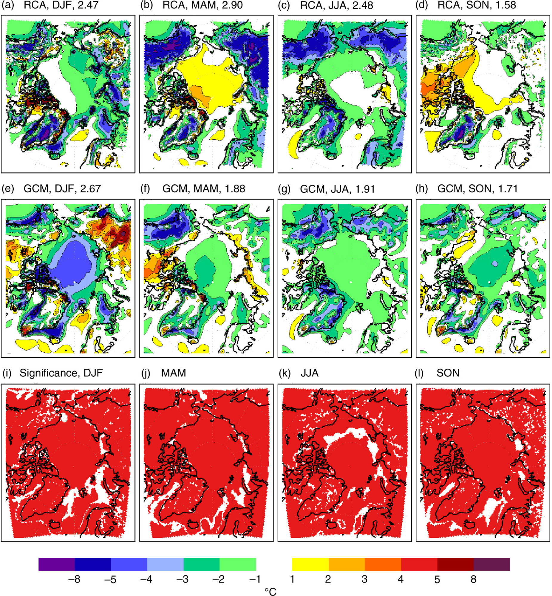 Two-metre air temperature bias (in °C) compared to the reanalysis data set by the European Centre for Medium-range Weather Forecasts (ERA-interim) for the period 1980–2005 in (a–d) the ensemble mean of Rossby Centre Atmosphere model (RCA) downscalings of global models (GCM) and (e–h) the ensemble mean of the global models. The projections are based on RCP8.5. The numbers in the titles (a–h) indicate the model area averaged root mean square error (in hPa). Red areas in (i–l) mark areas where the 2-m air temperature biases in regional and global simulations are significantly different (at the 95% confidence level).