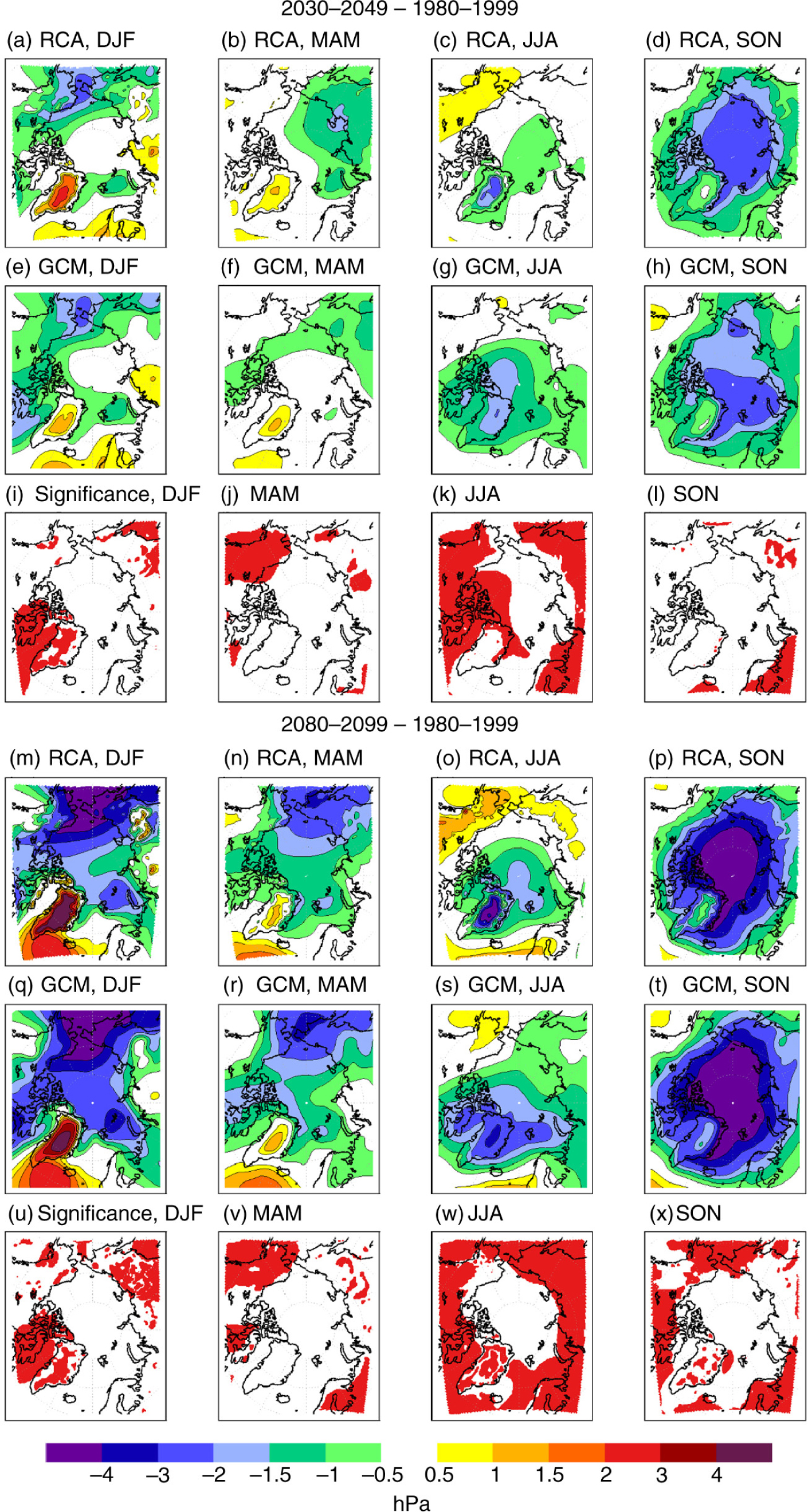 Sea-level pressure future change in the ensemble means of the Rossby Centre Atmosphere model (RCA) downscalings and the global models (GCM) for the periods (a–l) 2030–2049 and (m–x) 2080–2099 compared to the reference period 1980–1999. The projections are based on RCP8.5. The red areas in (i–l) and (u–x) mark areas with significantly different responses in regional and global simulations (at the 95% confidence level).