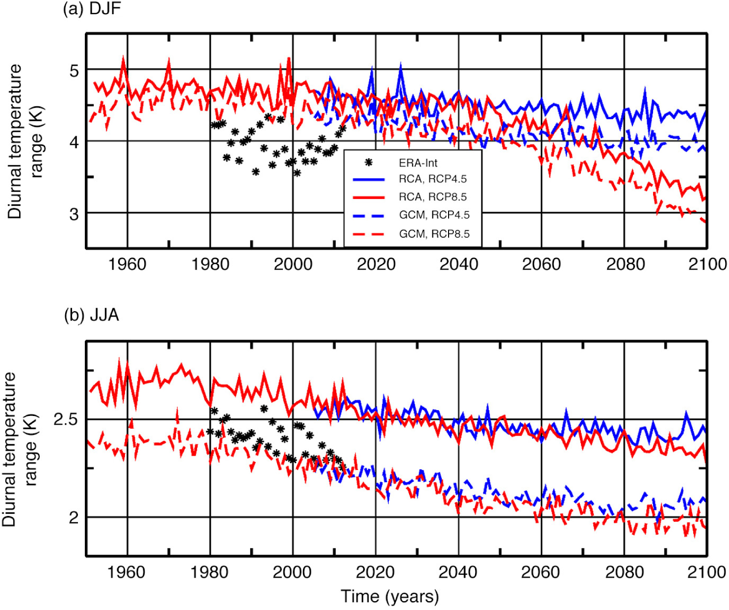 Diurnal temperature range in (a) winter and (b) summer in the historical and future scenario simulations of the Rossby Centre Atmosphere model (RCA) and their driving global models (GCM). Shown are ensemble means averaged over 70–90°N. Also shown are values for to the reanalysis data set by the European Centre for Medium-range Weather Forecasts (ERA-Int).