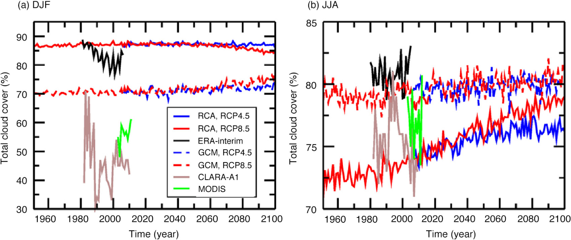 Total cloud cover in the ensemble mean of the Rossby Centre Atmosphere model (RCA) downscalings, the ensemble mean of the global models (GCM), the reanalysis data set by the European Centre for Medium-range Weather Forecasts (ERA-interim) and CALRA-A1 and MODIS satellite products in (a) winter (December–February) and (b) summer (June–August).