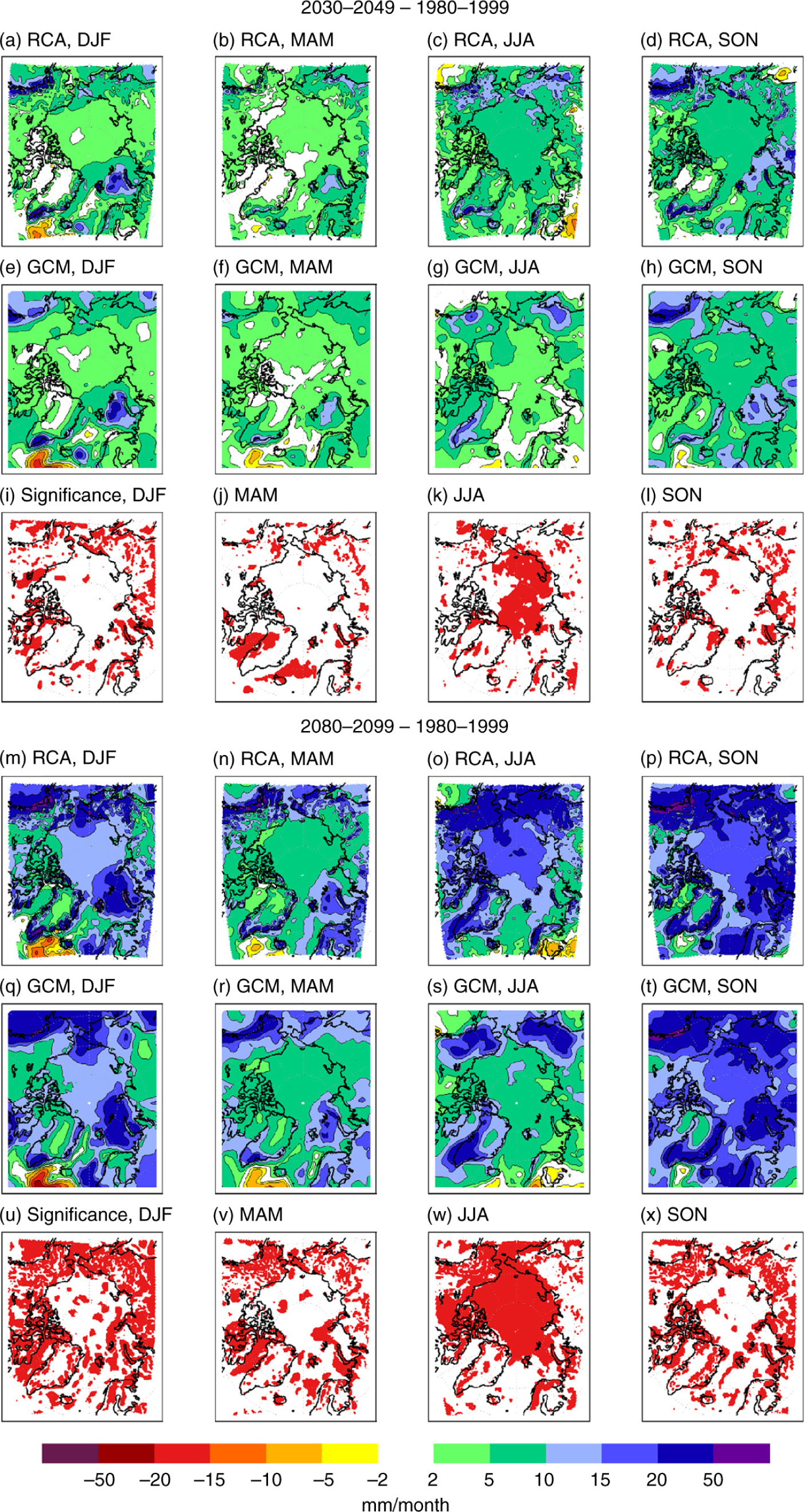 Precipitation (P) is increasing in all seasons almost everywhere in the Arctic (Fig. 11). In the near future period, the increase varies between 2 and 10 mm/month in most areas; in the Barents Sea and along some mountain ranges substantially more. The largest increase occurs in autumn. The change pattern and the amplitude agree in regional downscalings and their global originals. However, we see more small-scale variations in the regional results over land areas and near the coastlines, probably due to the higher resolution and better-resolved topography compared to the global models. Many of these small-scale patterns in RCA are significantly different from the global model results. The P increase continues until the end of the 21st century; the largest P-changes still occur in autumn. The further increase of P over the Arctic Ocean after 2030–2049 is particularly large in winter and autumn. Kattsov et al. (2007) investigated the CMIP3 ensemble, and found results similar to those presented here, with an increase of P in the entire Arctic both in summer and winter. Furthermore, they found the largest increase in the Barents Sea area and the Chukchi Sea in winter and summer, respectively. A similar change pattern was also found in regional downscalings with HIRHAM of the ECHAM5/MPI-OM global model by Rinke & Dethloff (2008). However, their results indicate an increase of P up to 500% in the Barents Sea area, which is much more than in our model ensemble mean. On the contrary, results from Vavrus et al. (2012) using CCSM4 indicated a more uniformly distributed P-increase in the Arctic.